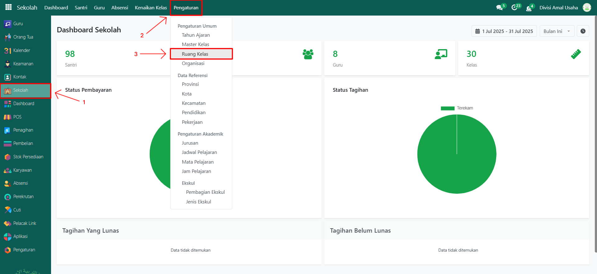 Buka modul Sekolah, lalu klik menu Pengaturan kemudian pilih submenu Ruang Kelas.