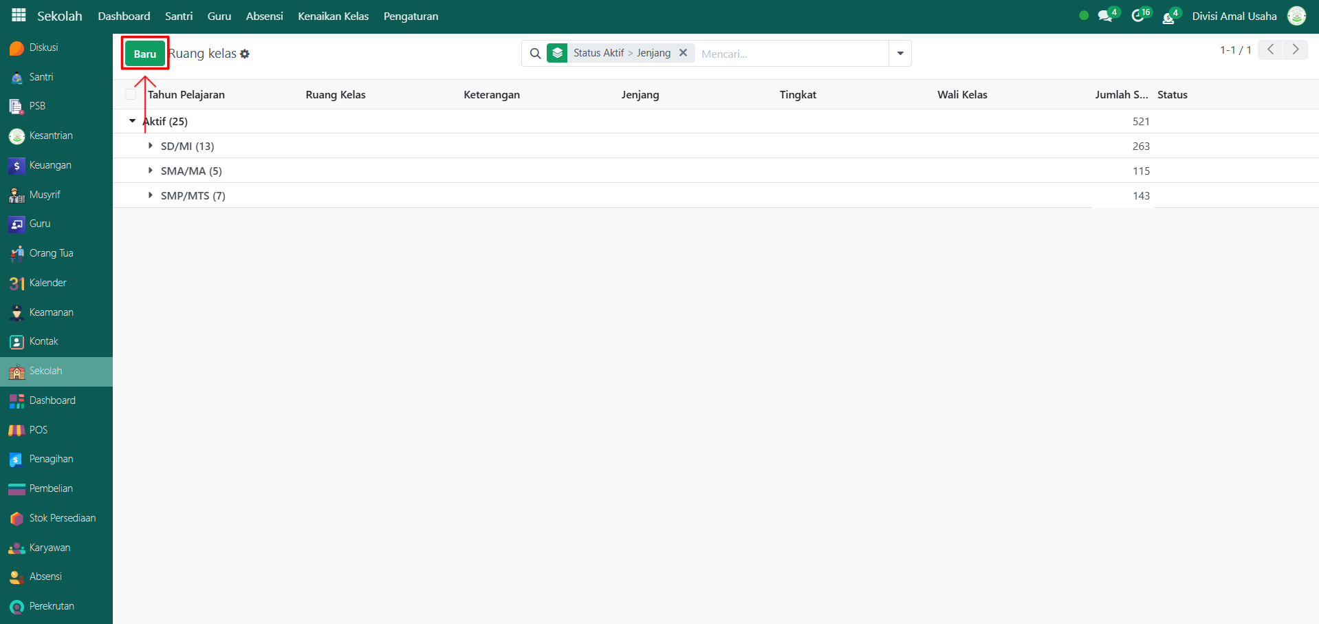 Klik tombol “Baru” untuk membuat data Ruang Kelas baru.