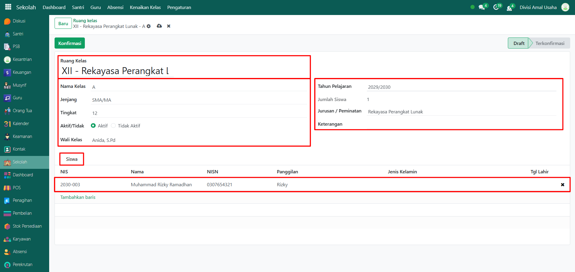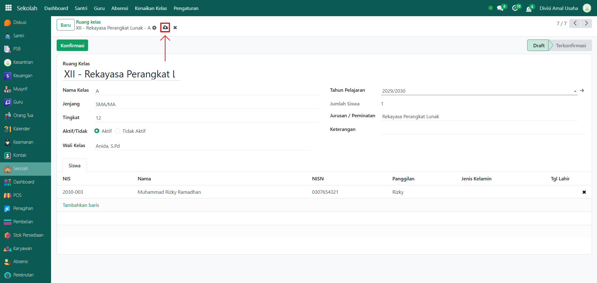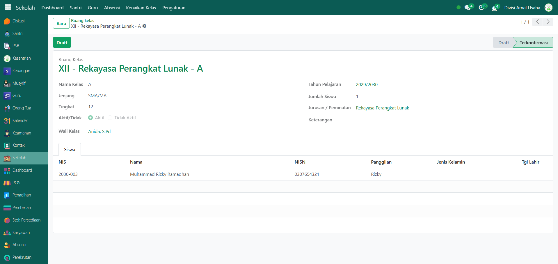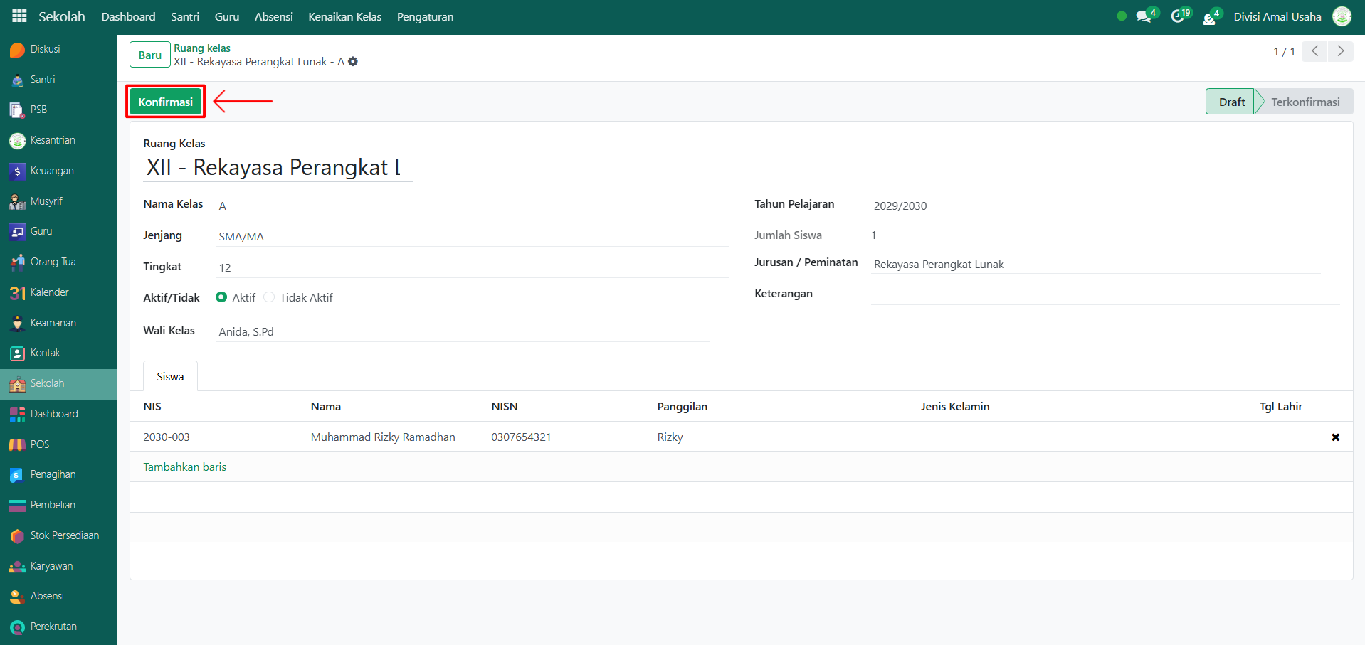Jika ruang kelas sudah final dan terverifikasi oleh pihak pesantren, klik tombol "Konfirmasi" untuk mengaktifkan ruang kelas tersebut.