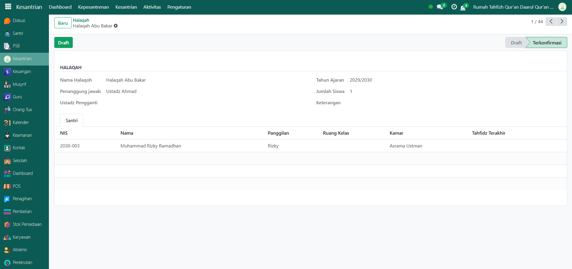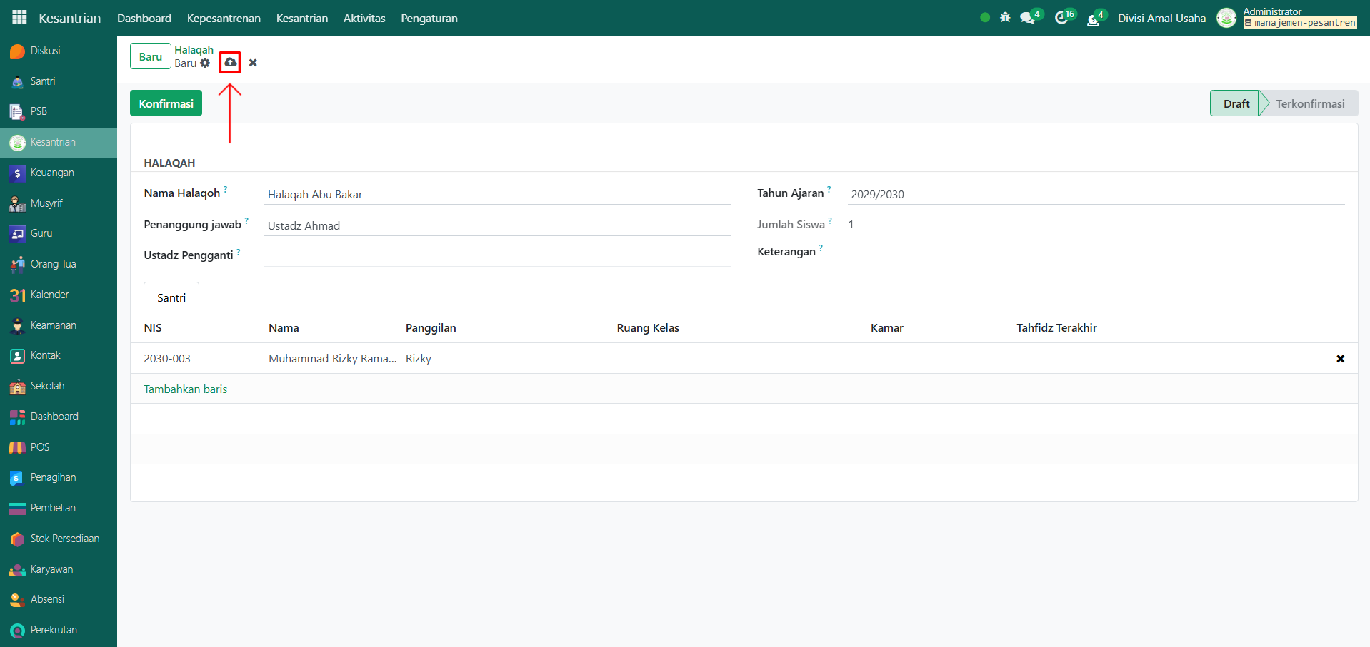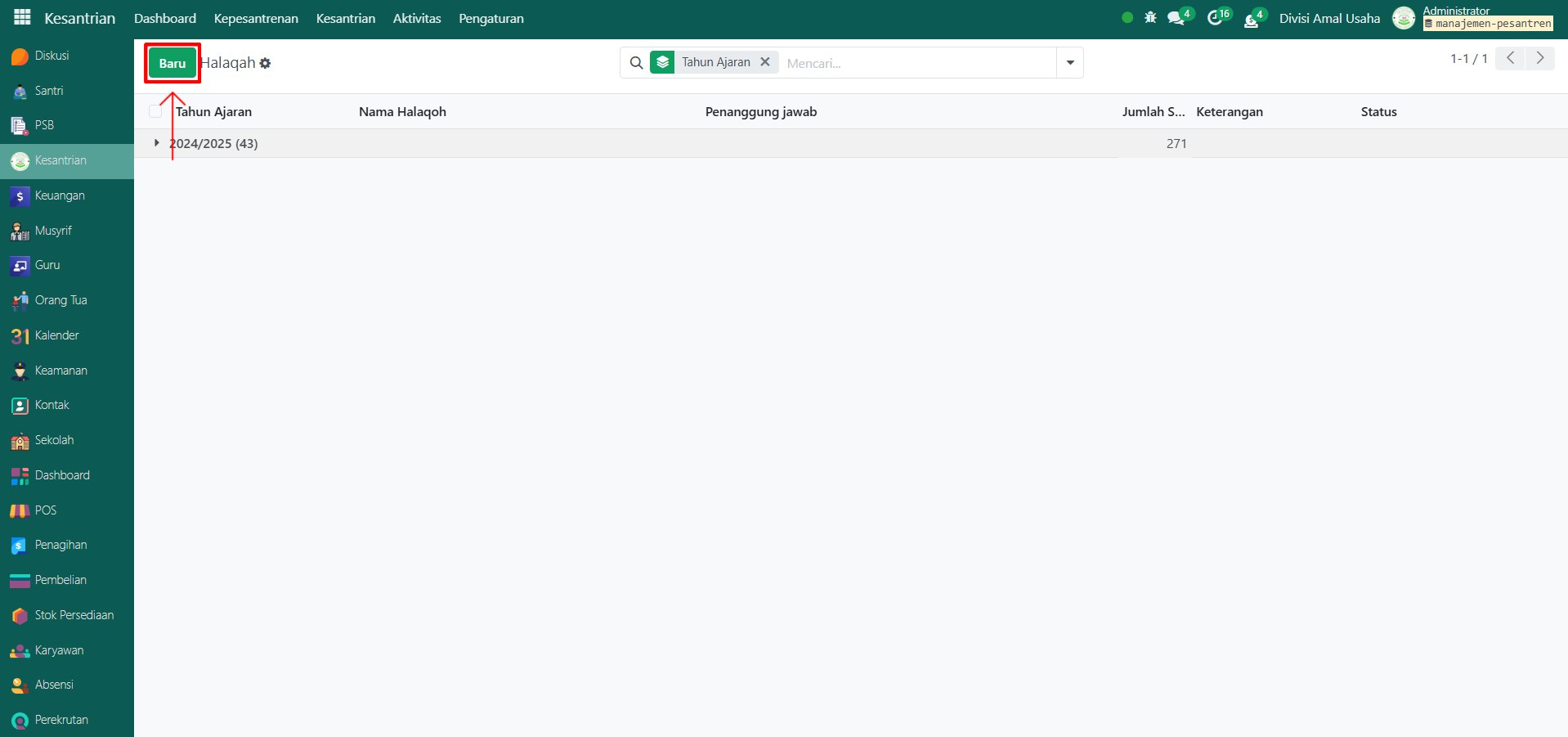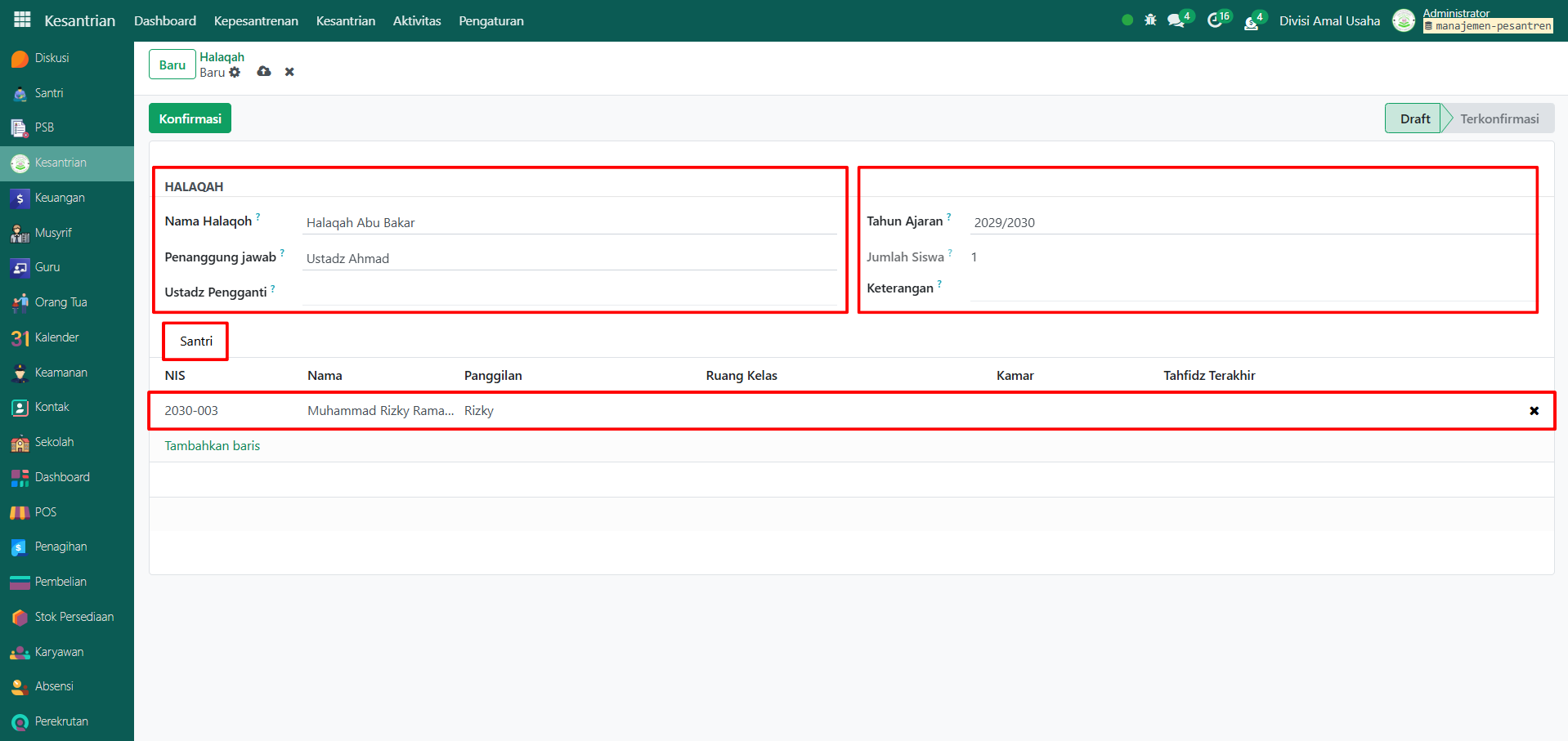 Berikut adalah langkah-langkah untuk menambahkan halaqah pada Odoo Pesantren.