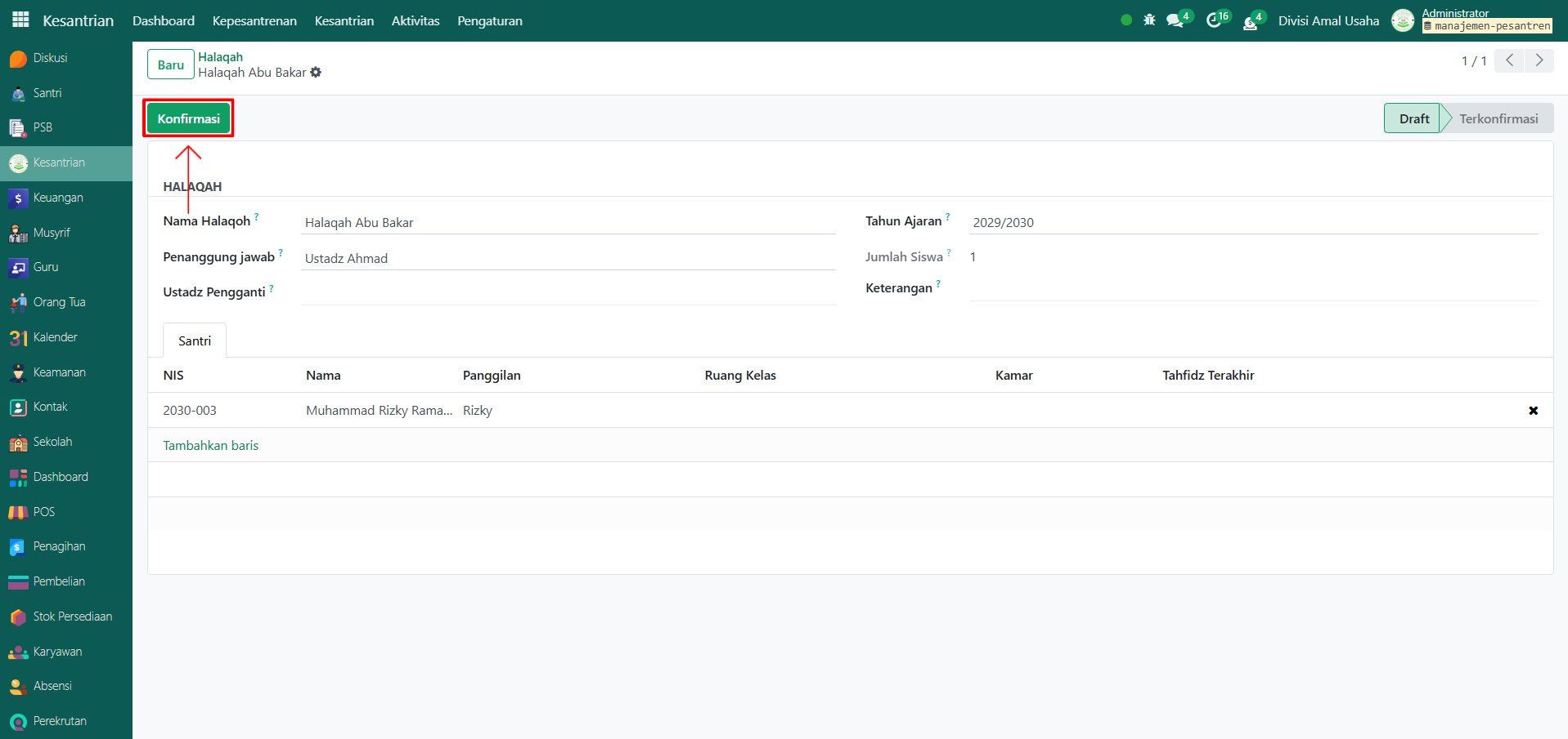 Apabila halaqah sudah terkonfirmasi oleh pihak pesantren, maka klik tombol "Konfirmasi" untuk mengkonfirmasi data yang disimpan.