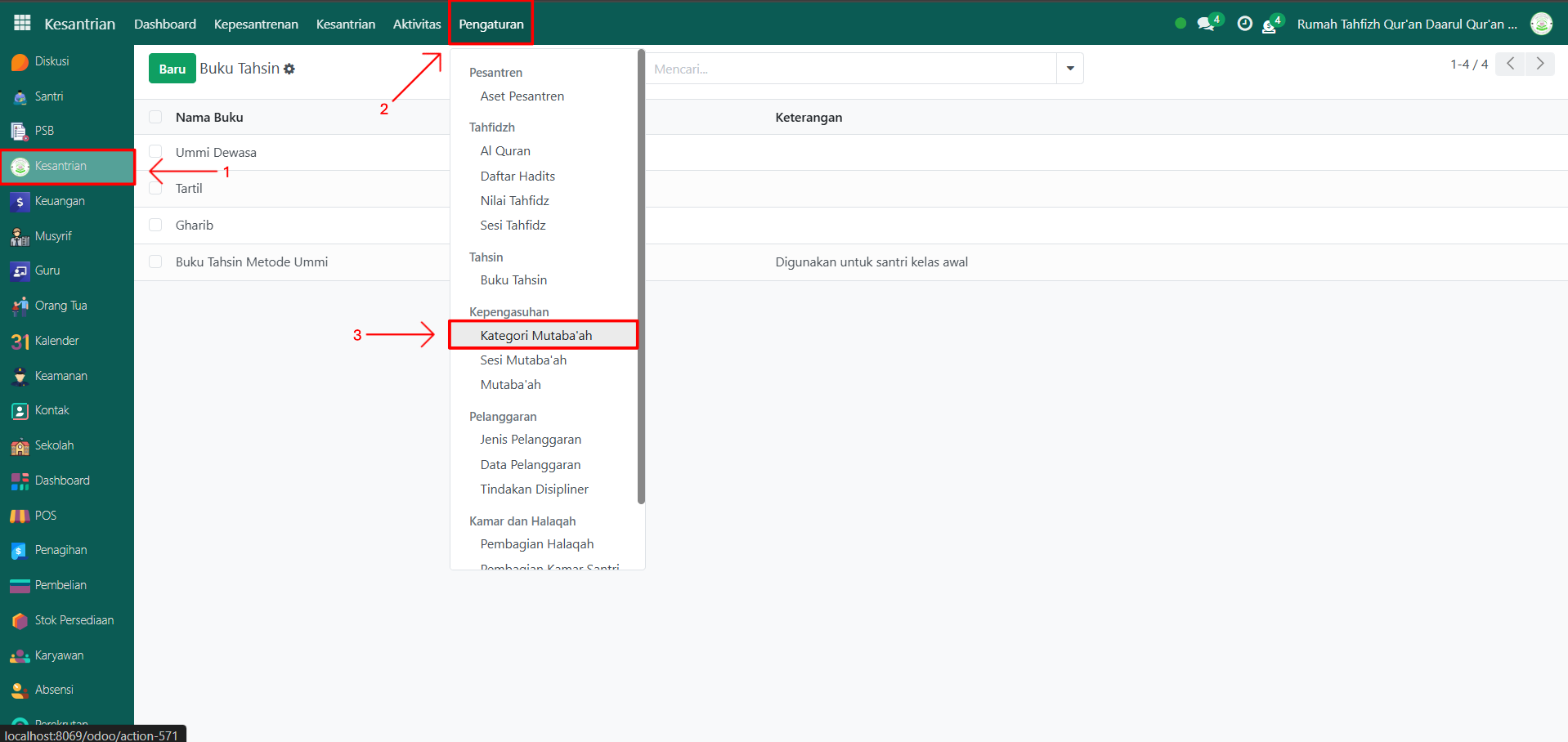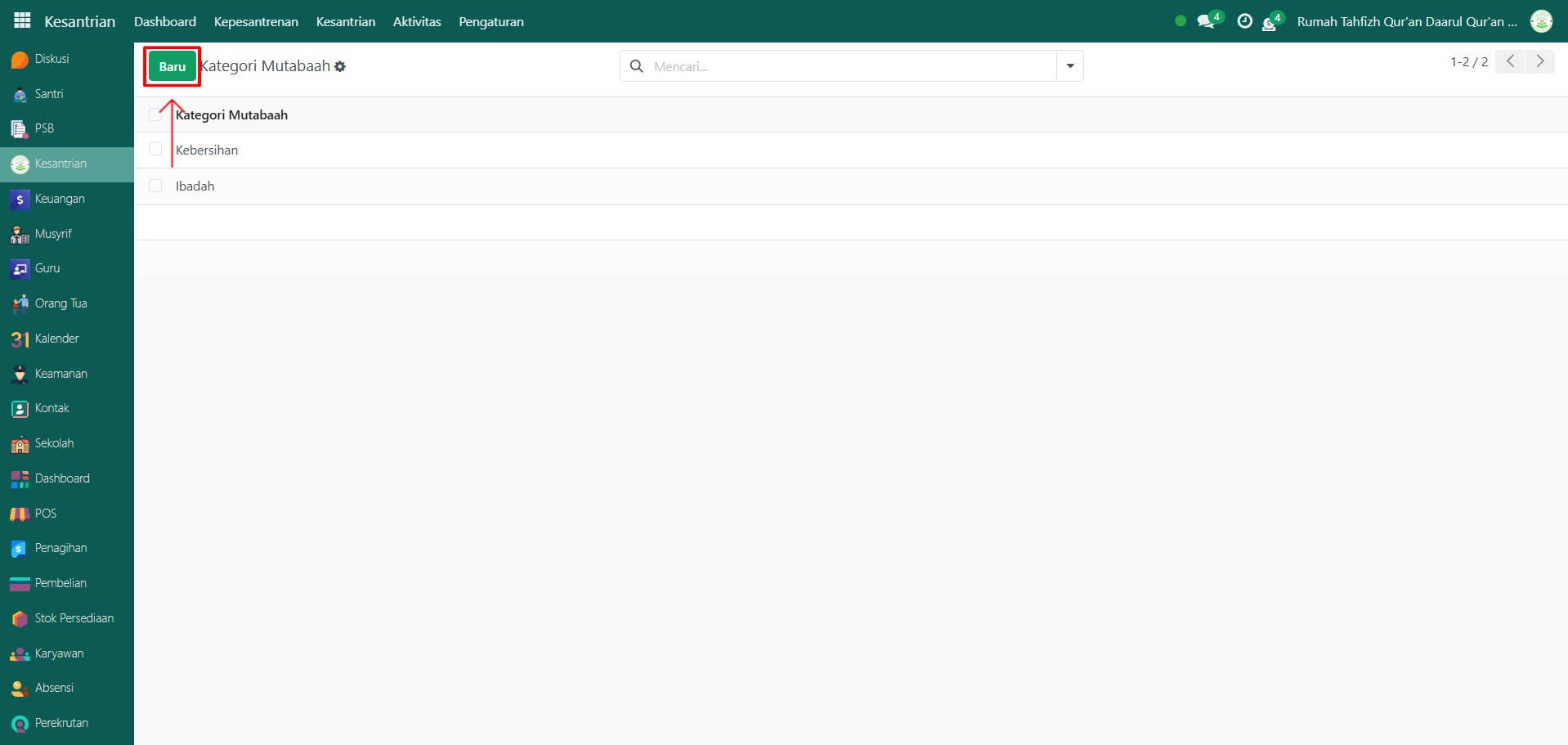 Buka modul Kesantrian, lalu klik menu Pengaturan kemudian pilih submenu Kategori Mutaba'ah.