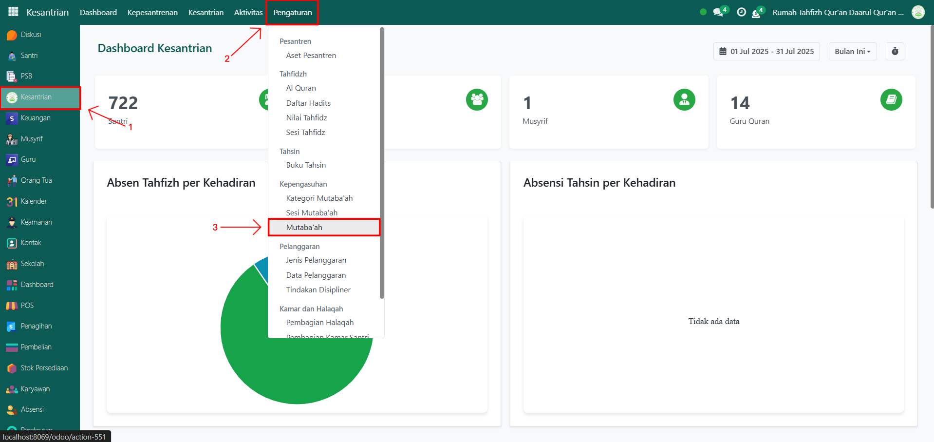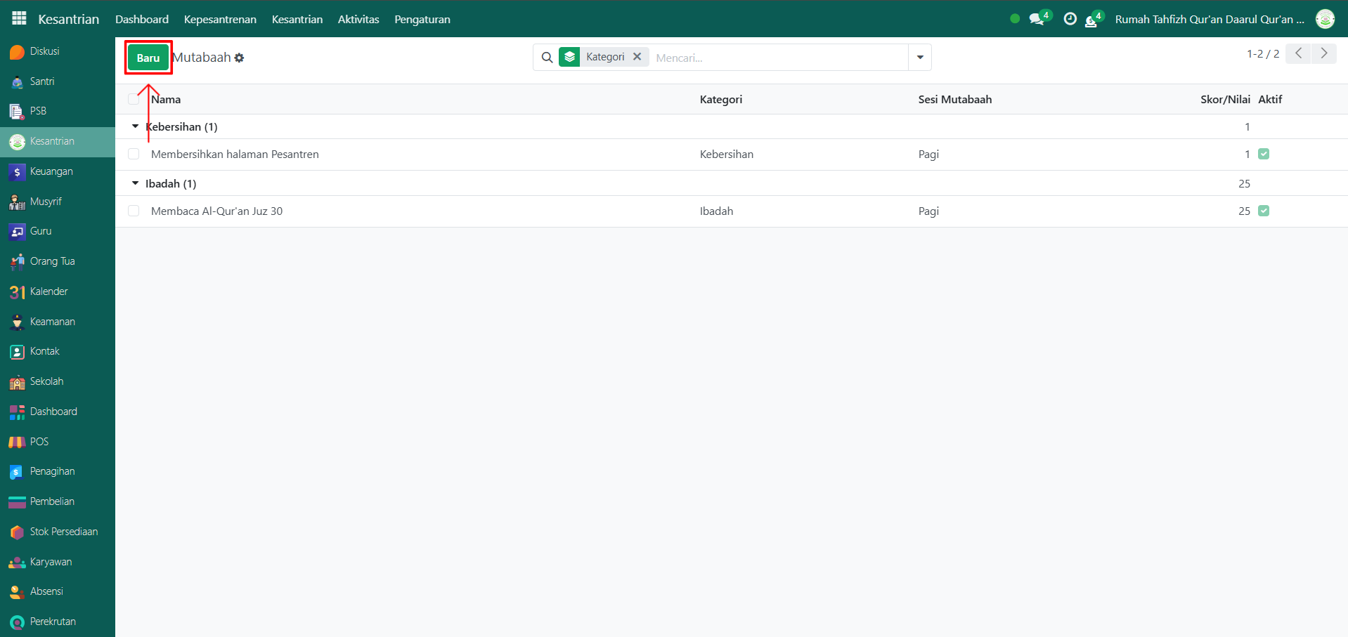 Buka modul Kesantrian, lalu klik menu Pengaturan kemudian pilih submenu Mutabaah.