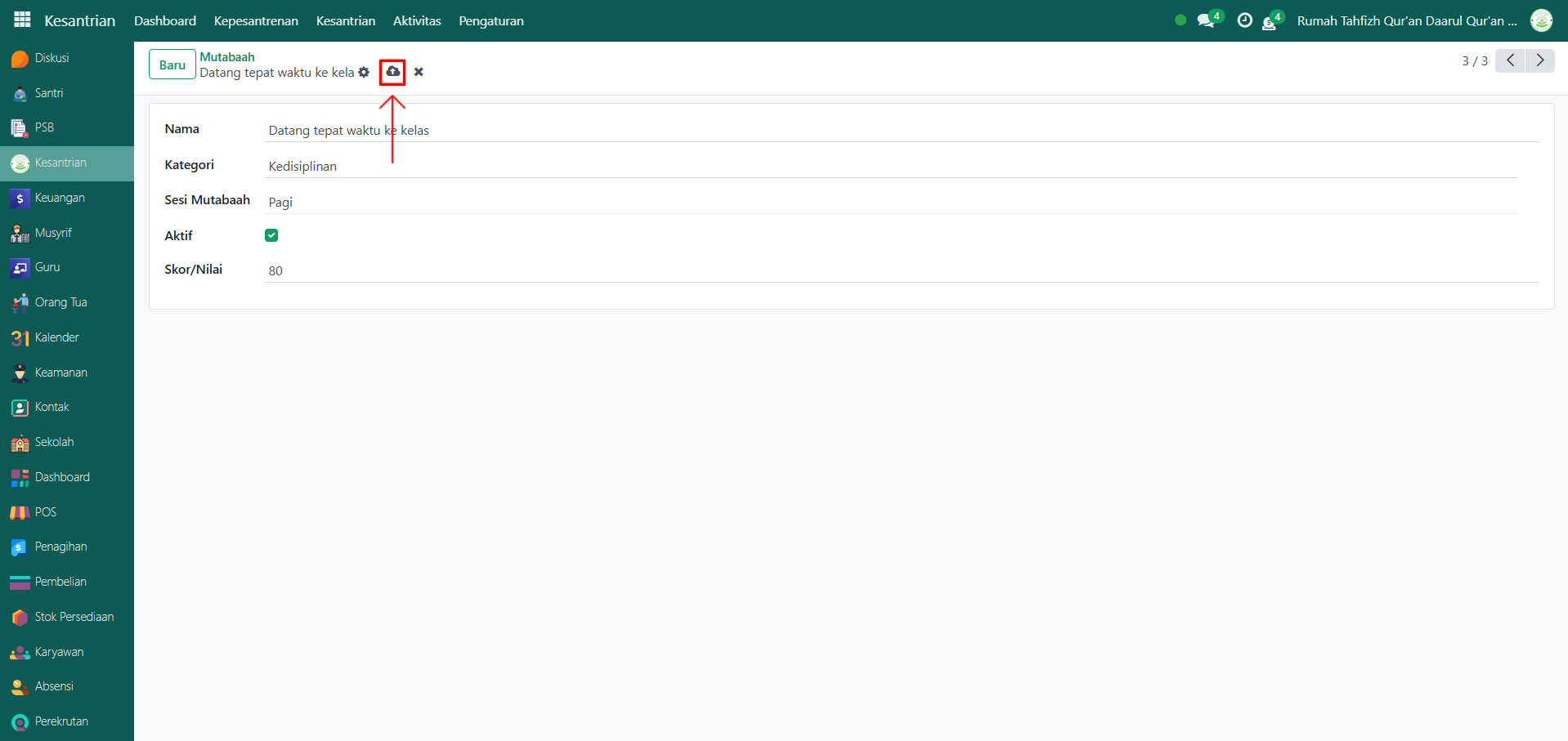 Setelah semua inputan diisi dengan benar, klik icon Simpan di sebelah kanan icon Gear agar data mutabaah tersimpan di sistem.