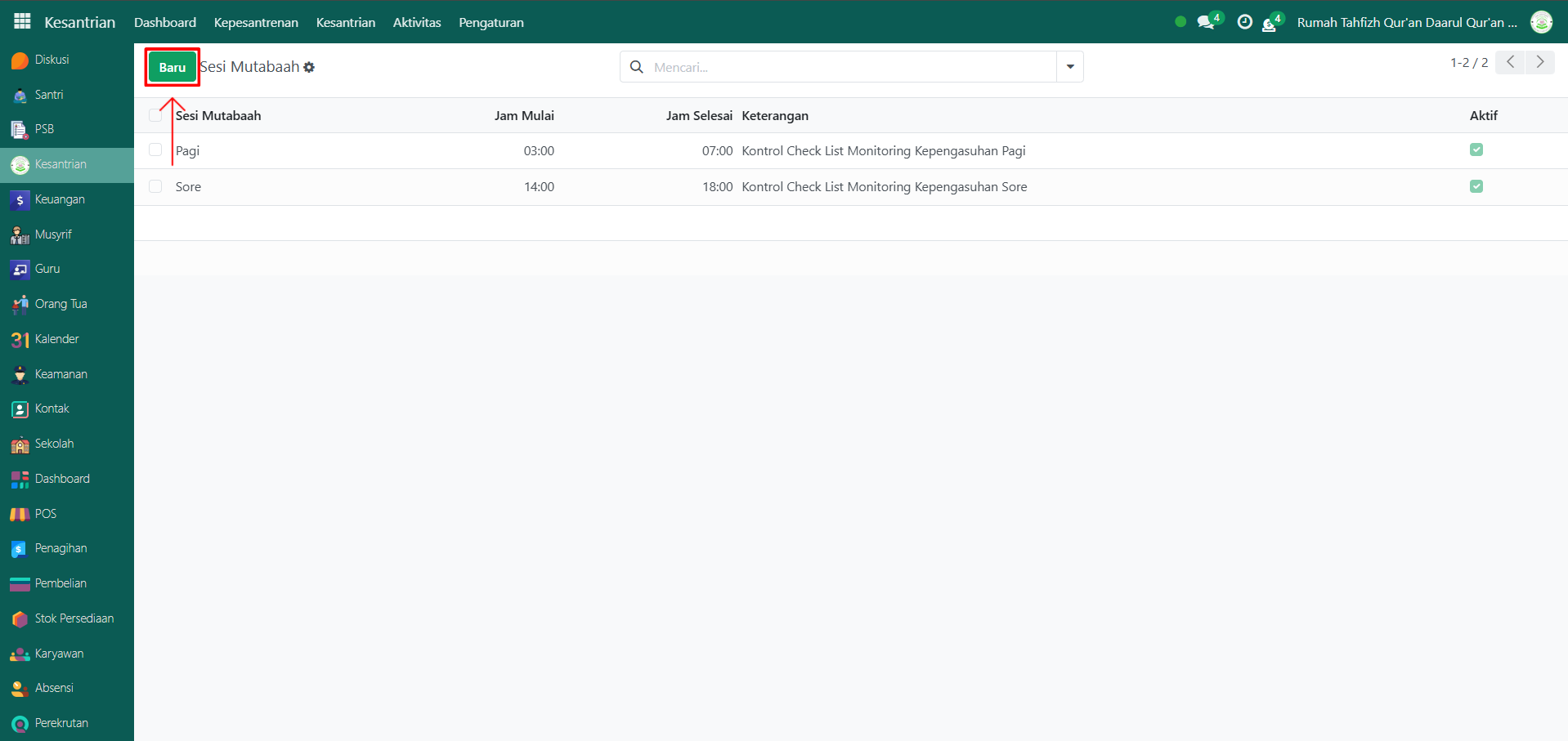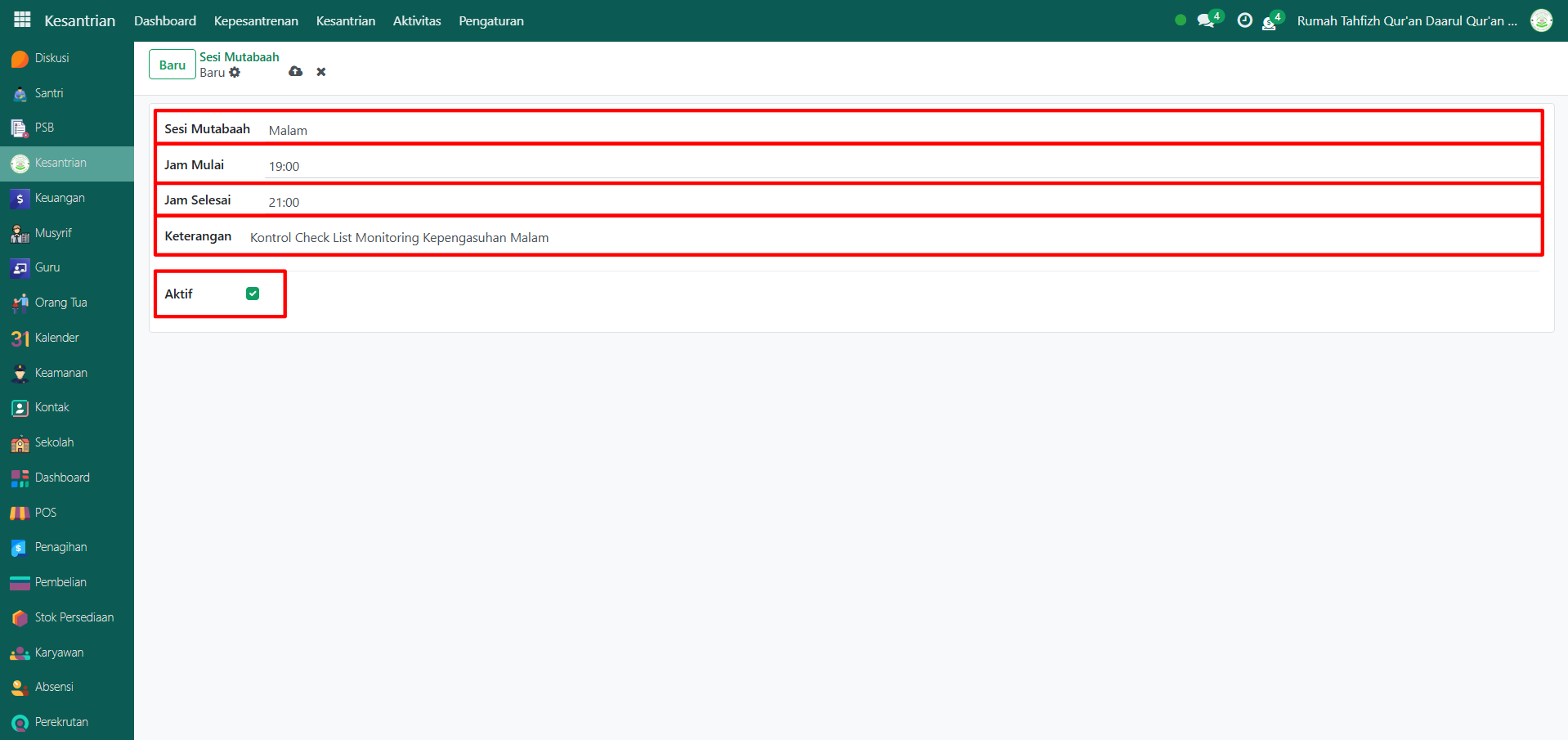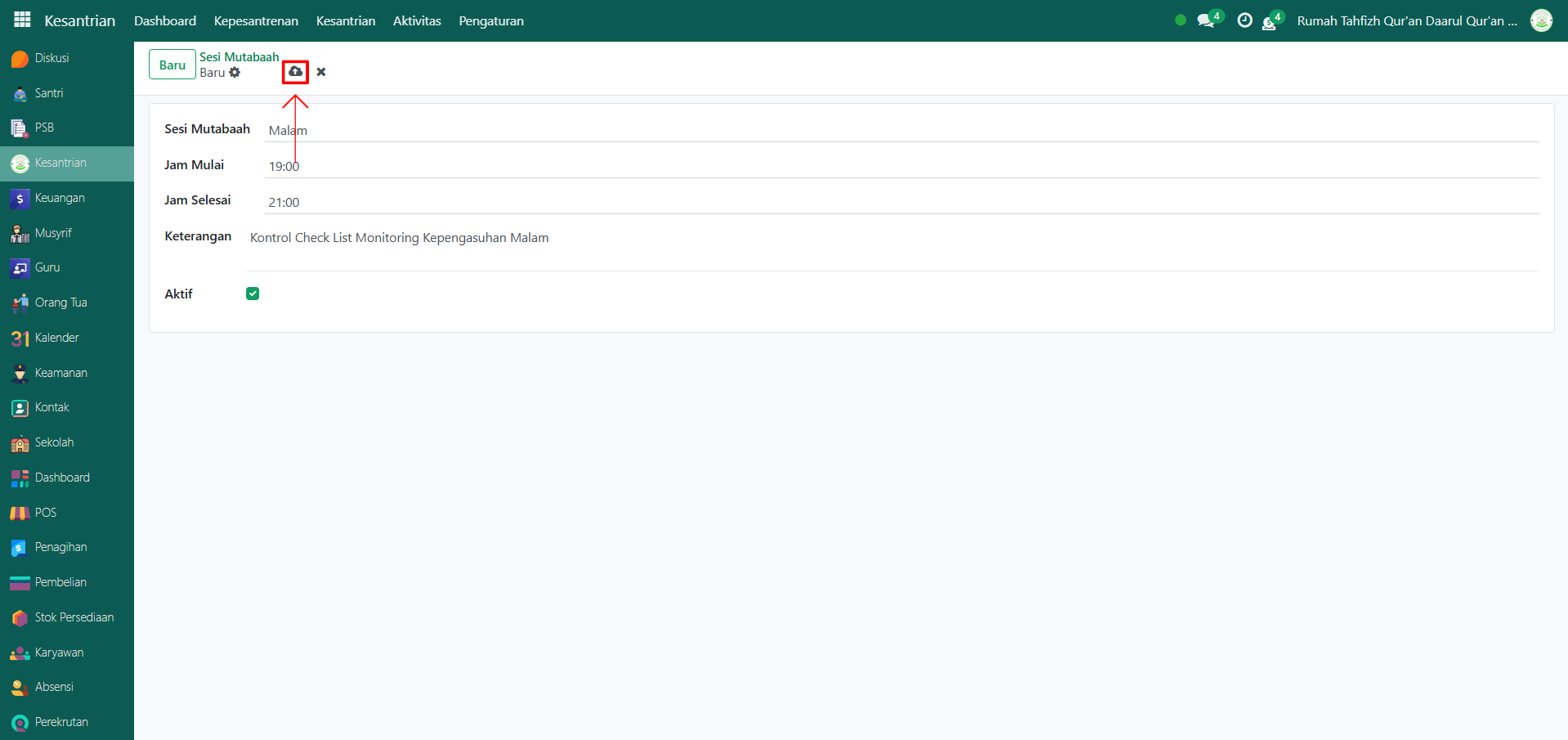 - Aktifkan checkbox "Aktif" jika sesi tersebut masih berjalan di pesantren.