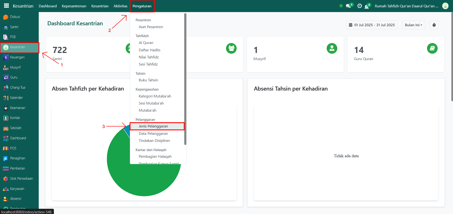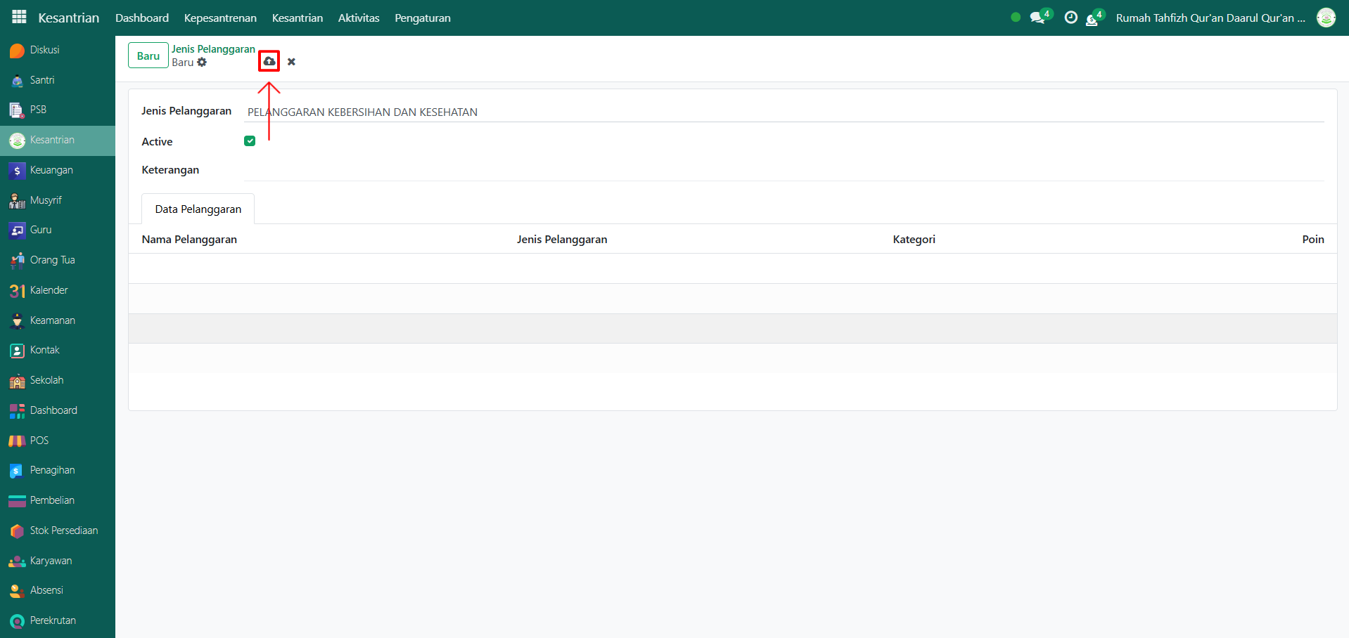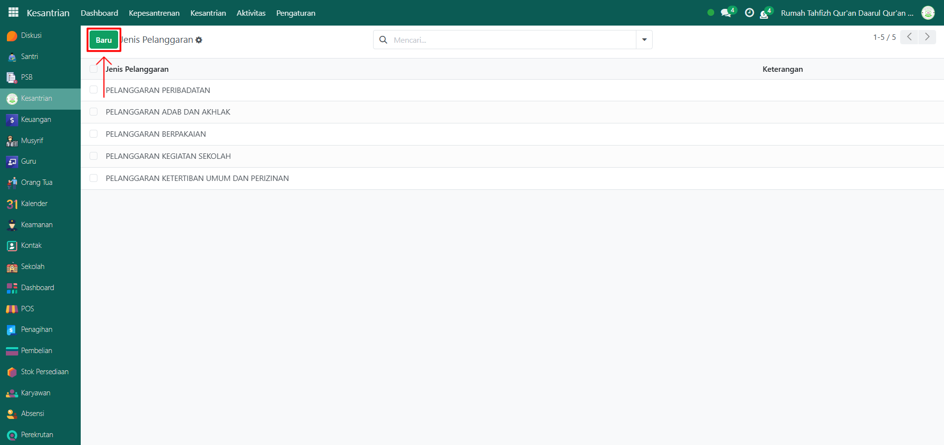 Buka modul Kesantrian, lalu klik menu Pengaturan kemudian pilih submenu Jenis Pelanggaran.