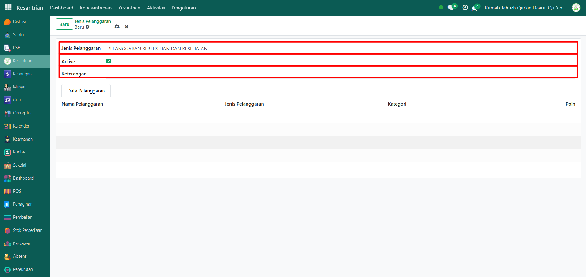 Berikut adalah langkah-langkah untuk menambahkan jenis pelanggaran pada Odoo Pesantren.