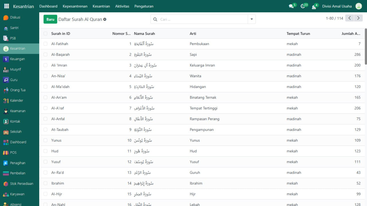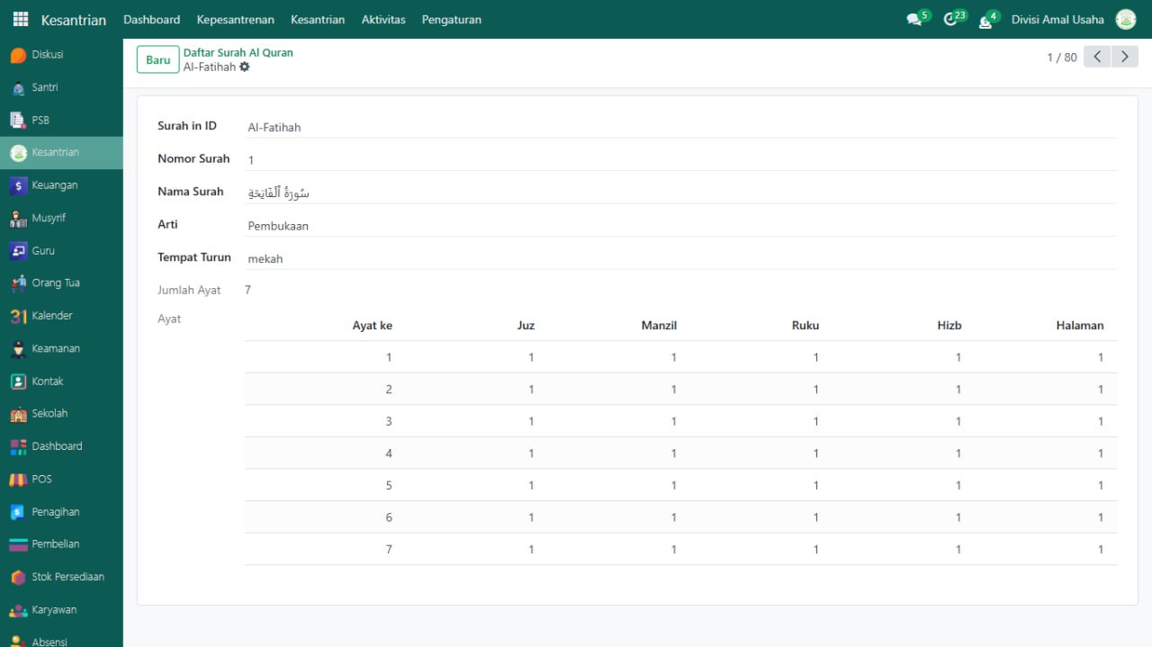 Data Al‑Qur’an pada Odoo Pesantren sudah tersedia secara lengkap mulai dari Surah Al‑Fatihah hingga An‑Nas beserta rincian ayatnya. Field ayat pada menu ini bersifat readonly sehingga tidak dapat diubah, namun sistem tetap menyediakan tombol “Baru” jika ingin menambahkan surah baru secara manual (meski biasanya tidak diperlukan).