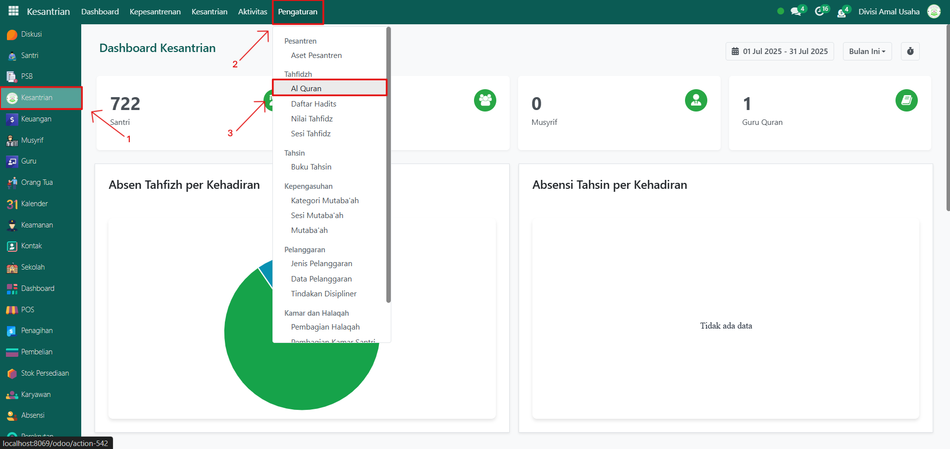 Buka modul Kesantrian, lalu klik menu Pengaturan kemudian pilih submenu Al-Qur'an.