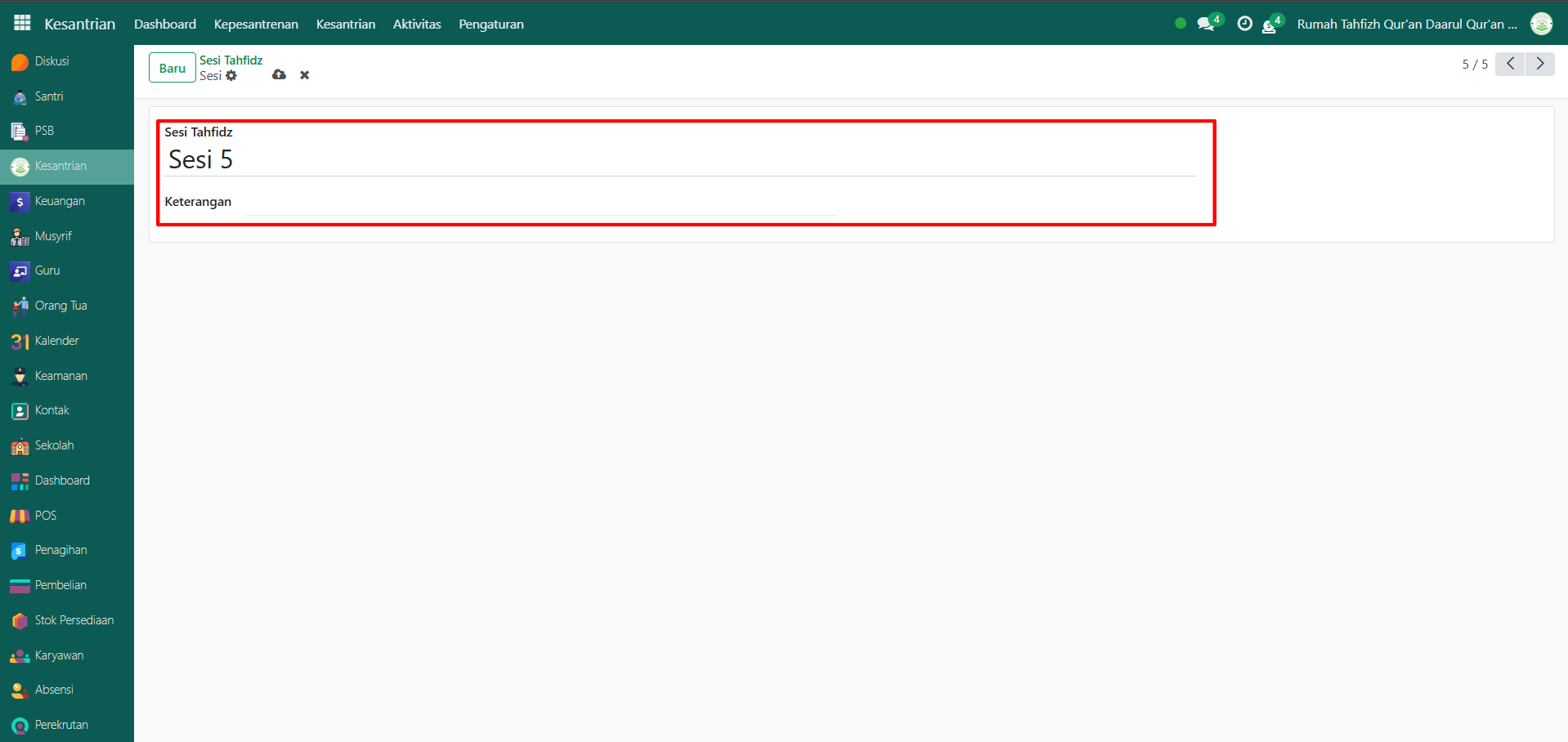 Klik tombol “Baru” untuk membuat data sesi tahfidz baru.