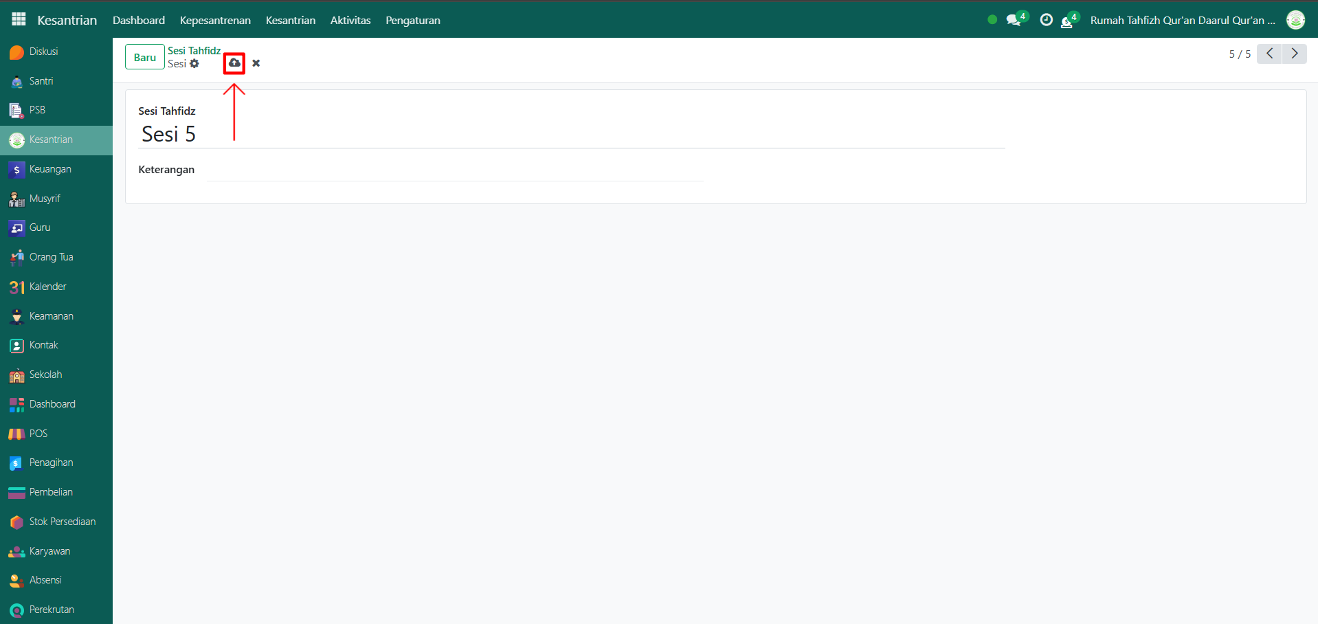 Setelah semua inputan diisi dengan benar, klik icon Simpan di sebelah kanan icon Gear agar data Sesi Tahfidz tersimpan di sistem.