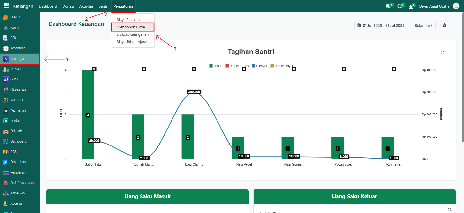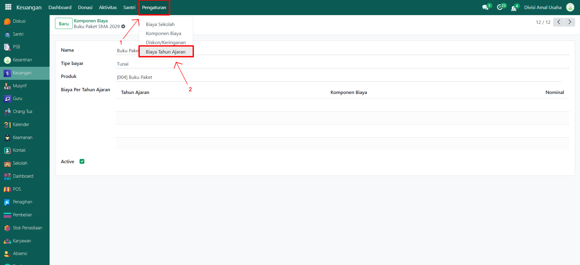 Masih di modul Keuangan, klik menu Pengaturan lalu pilih submenu Biaya Tahun Ajaran.