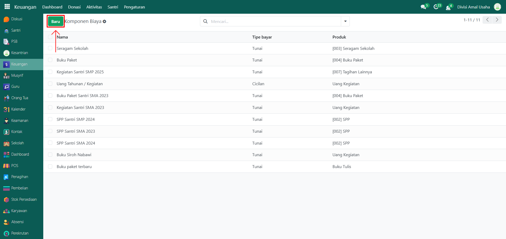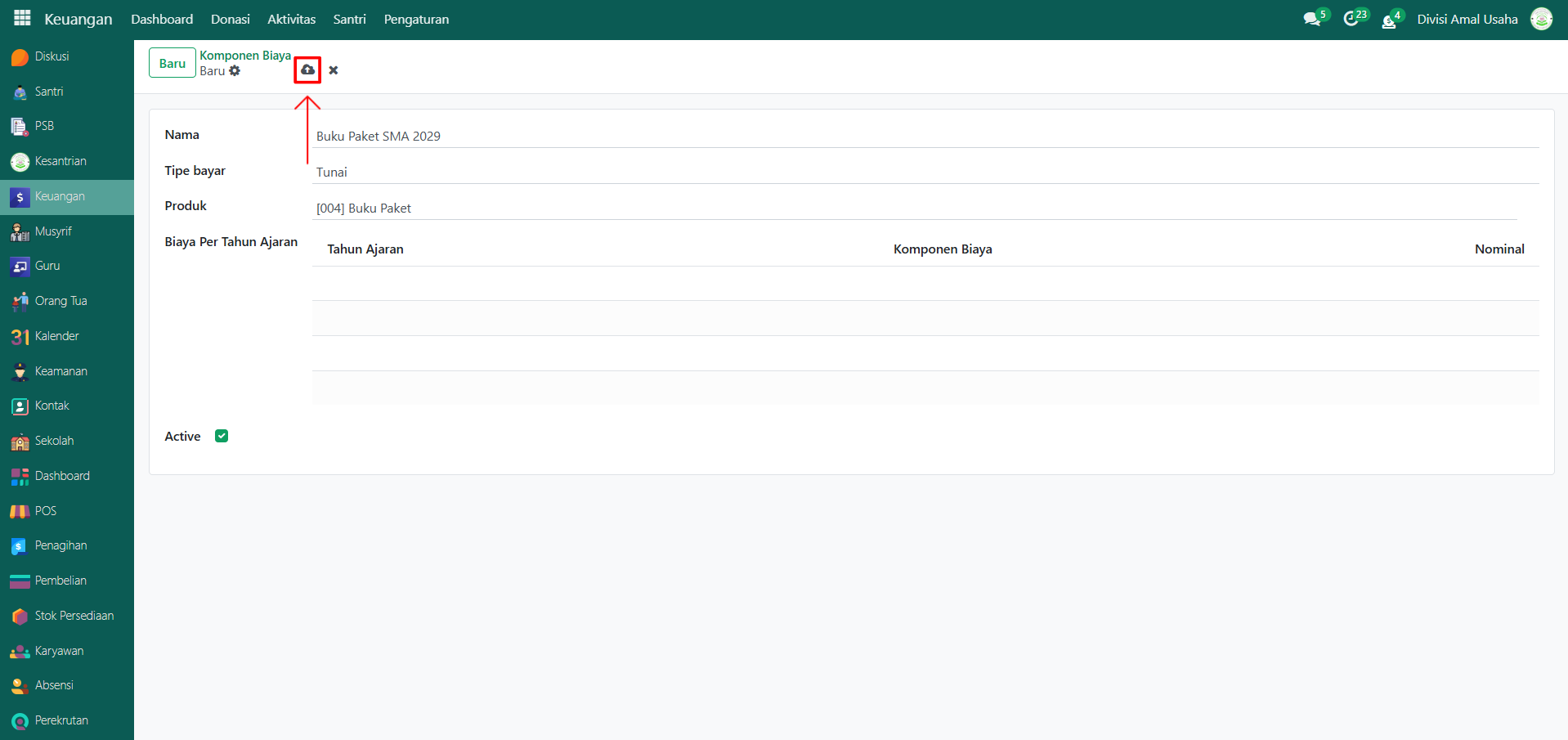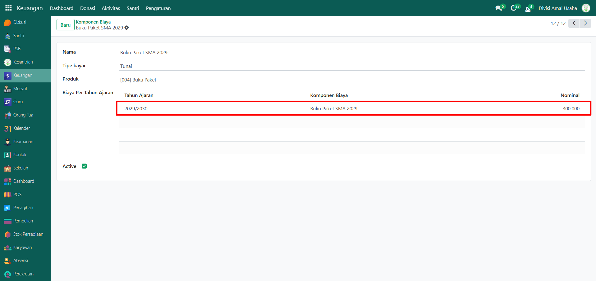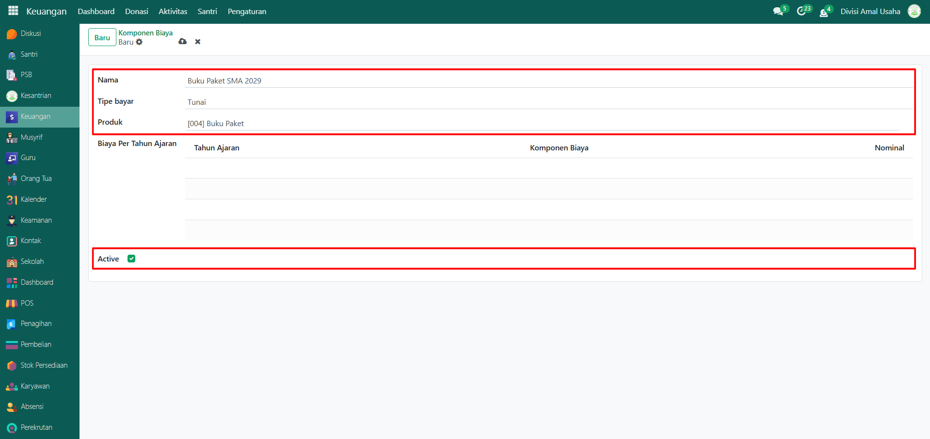 Berikut adalah langkah-langkah untuk menambahkan biaya komponen per tahun ajaran pada Odoo Pesantren.