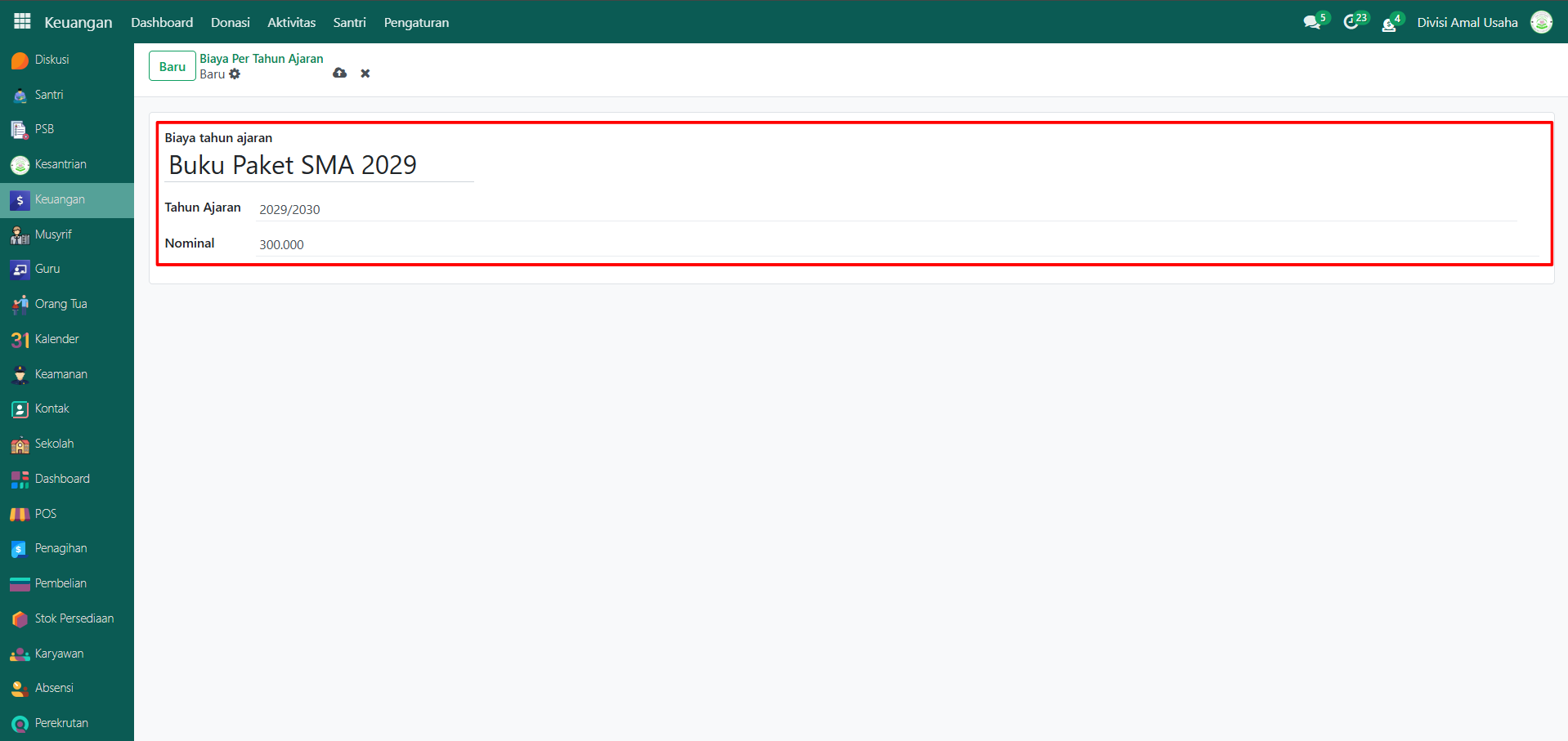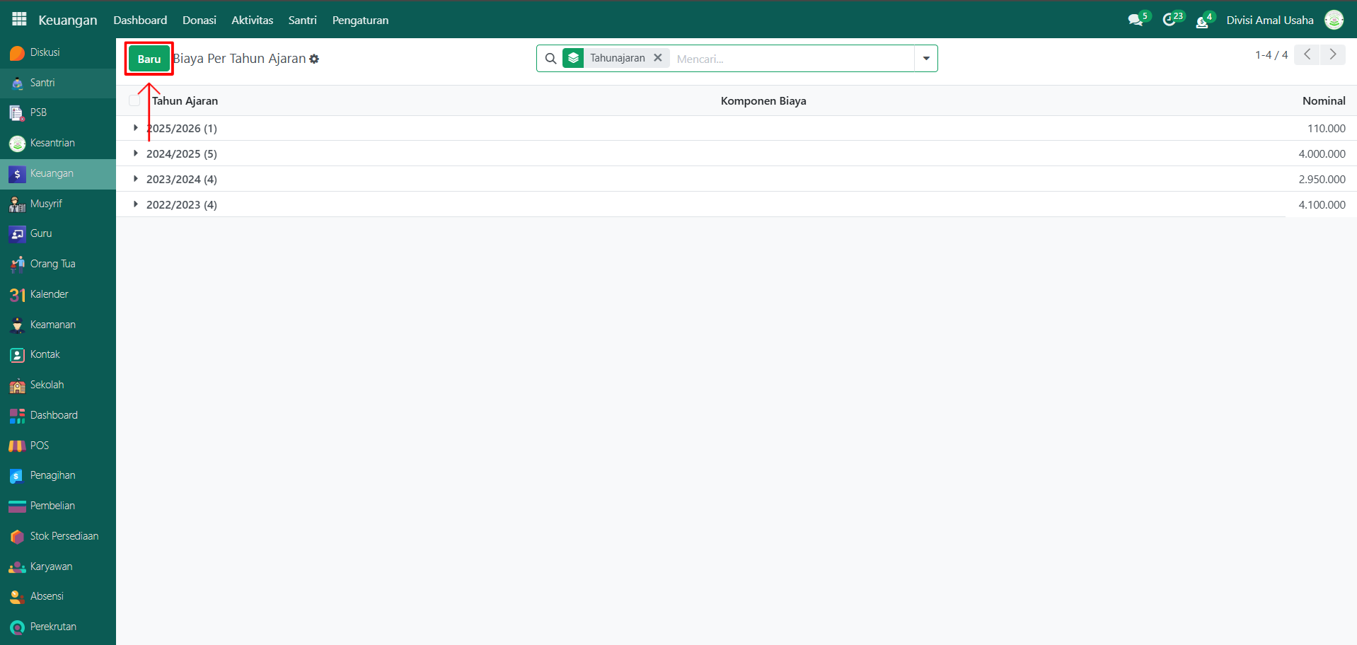Klik tombol "Baru" untuk membuat data biaya per tahun ajaran.