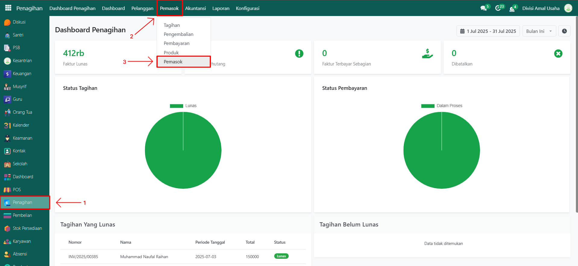 Buka modul Penagihan, lalu klik menu Pemasok kemudian pilih submenu Pemasok.