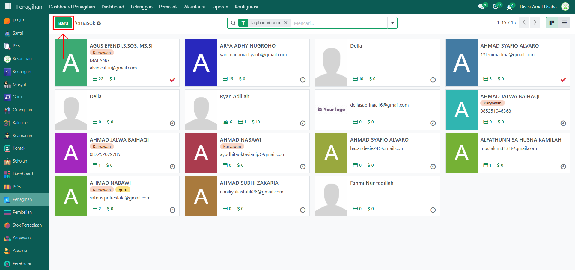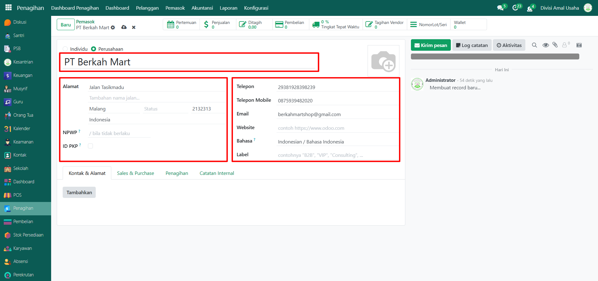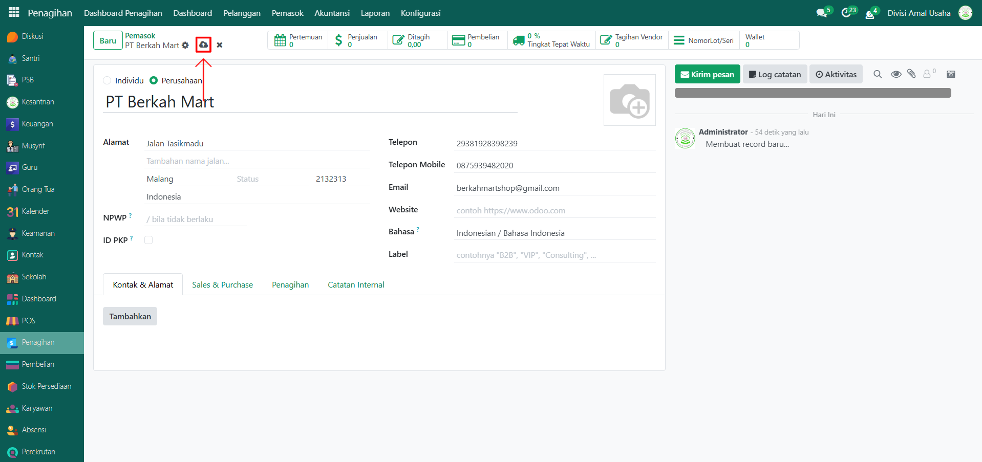 Berikut adalah langkah-langkah untuk menambahkan data pemasok pada Odoo Pesantren.
