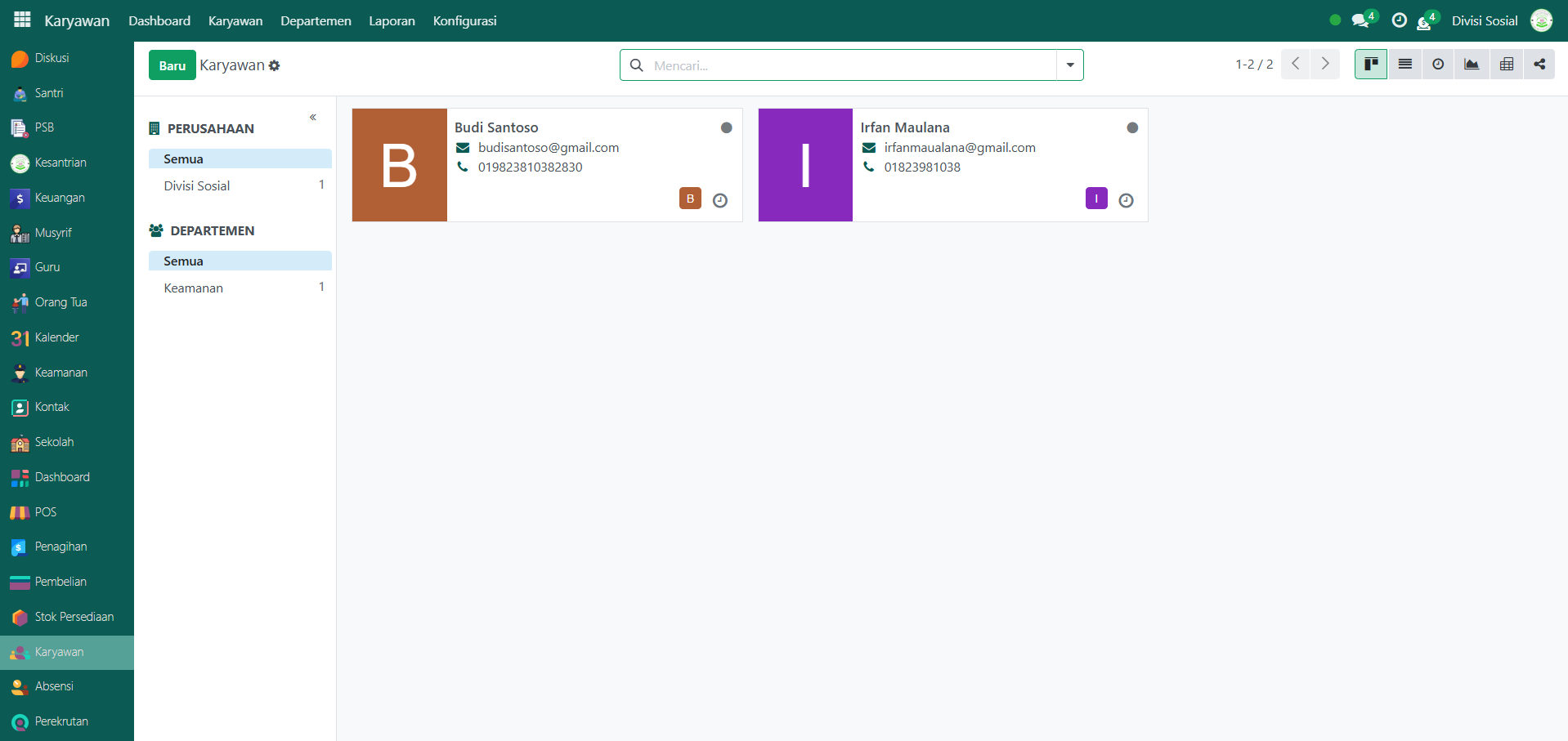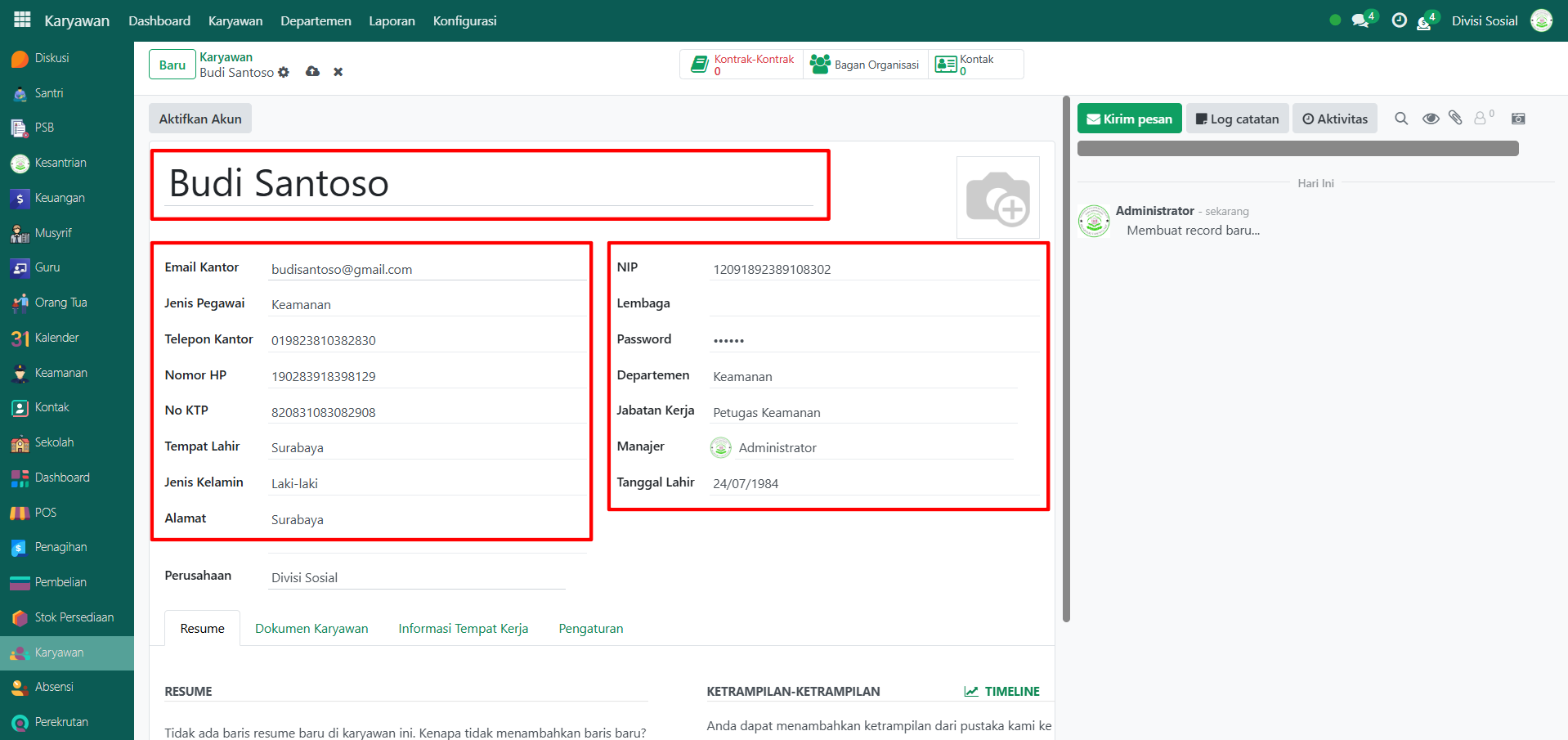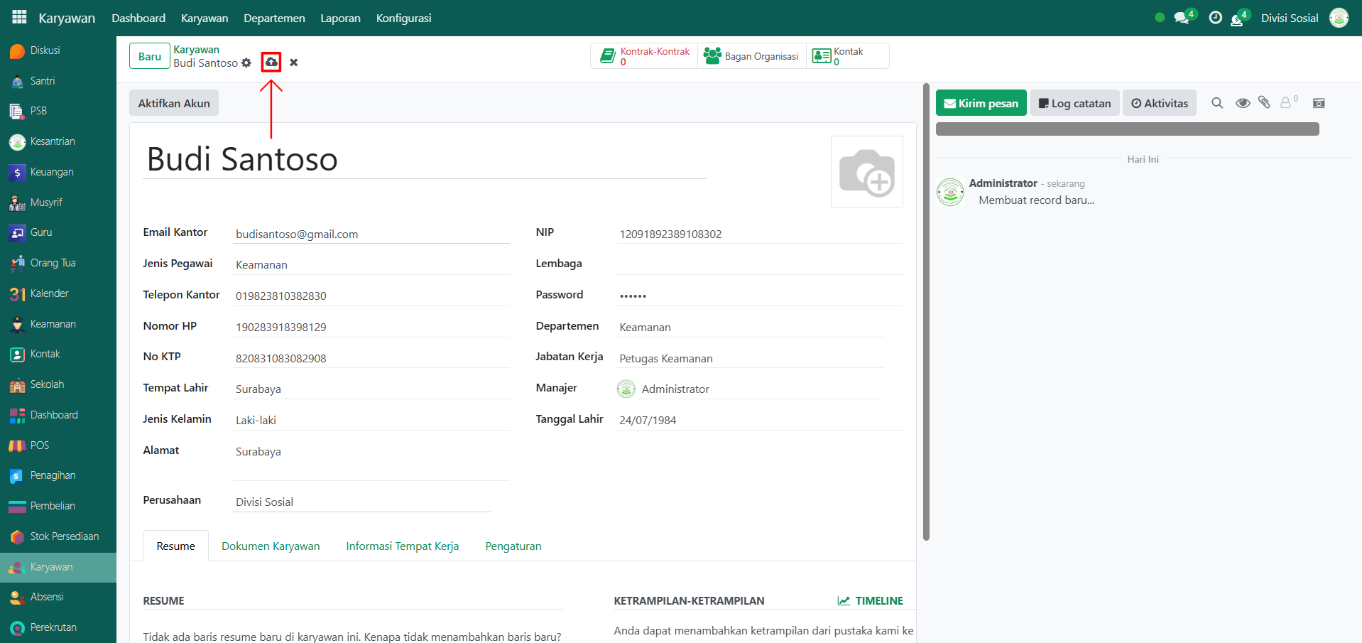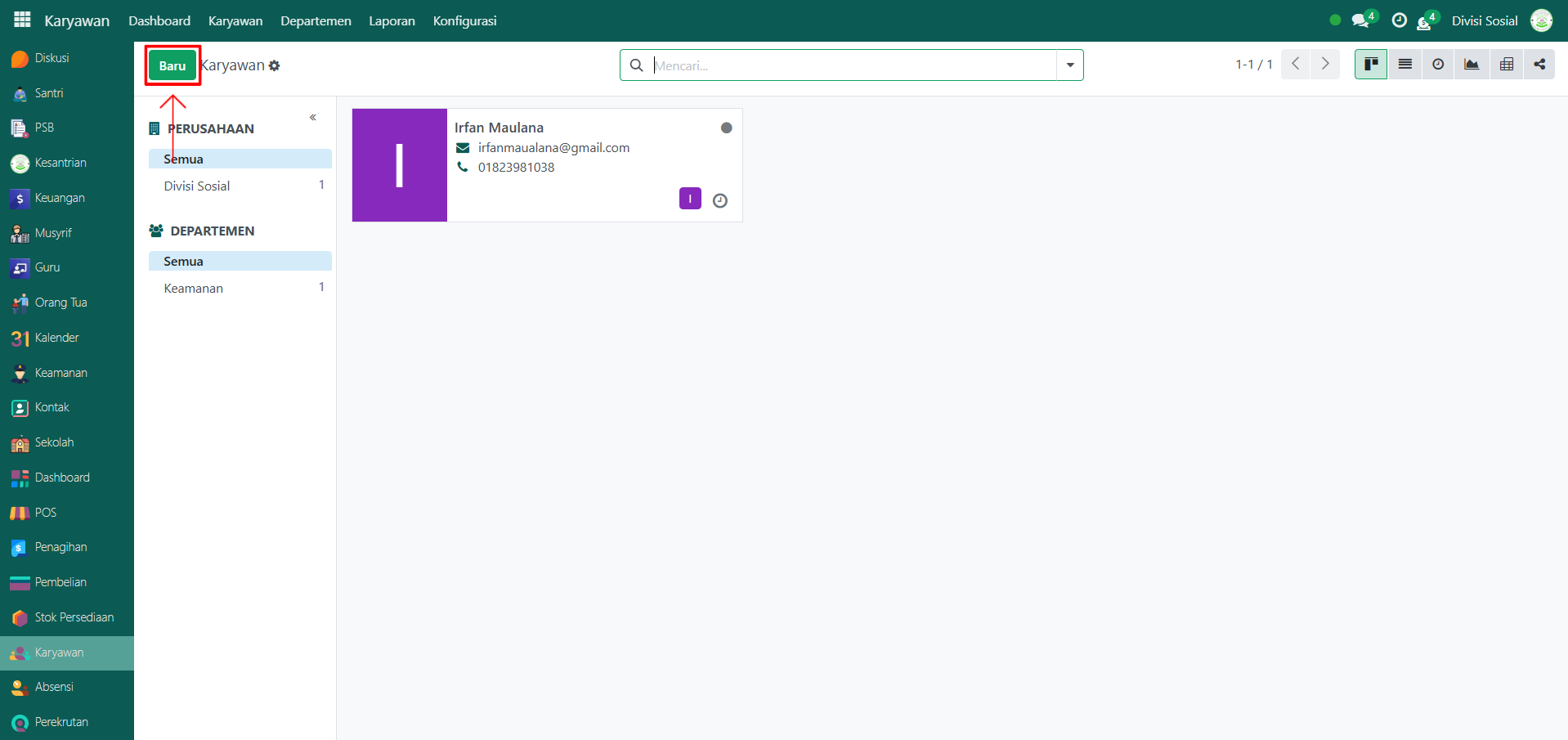 Berikut adalah langkah-langkah untuk menambahkan data Petugas Keamanan pada Odoo Pesantren.