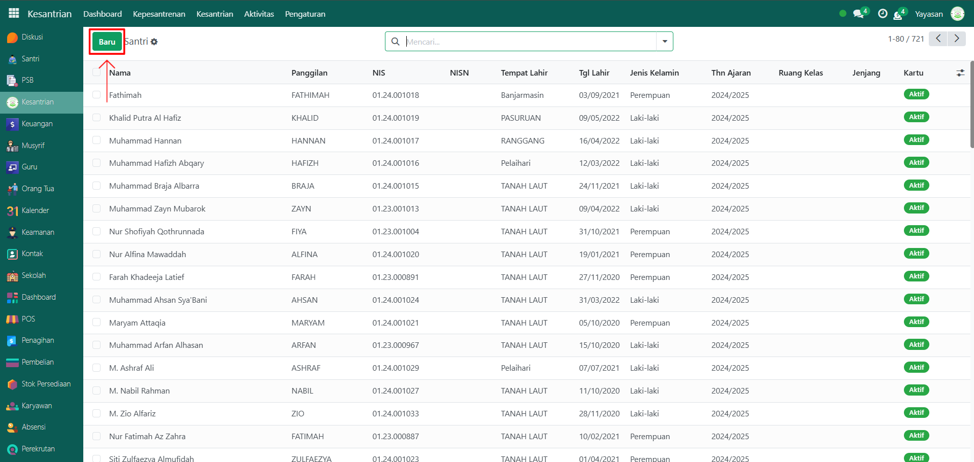 Klik tombol "Baru" untuk membuat data santri baru.