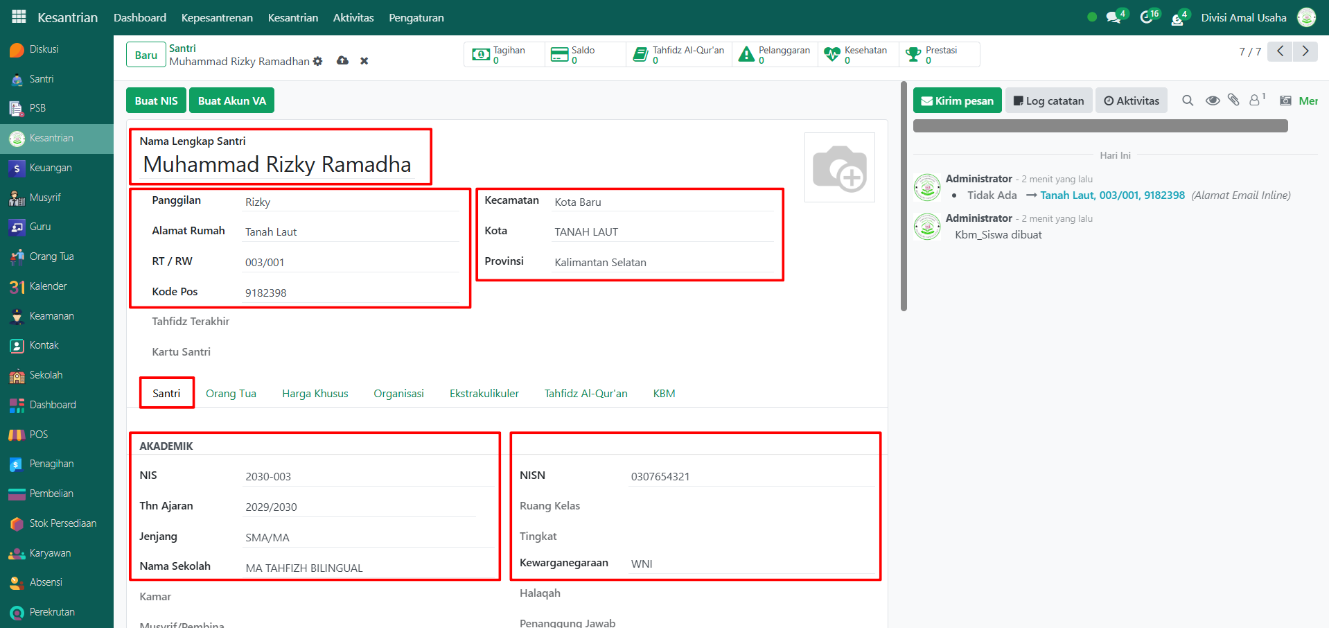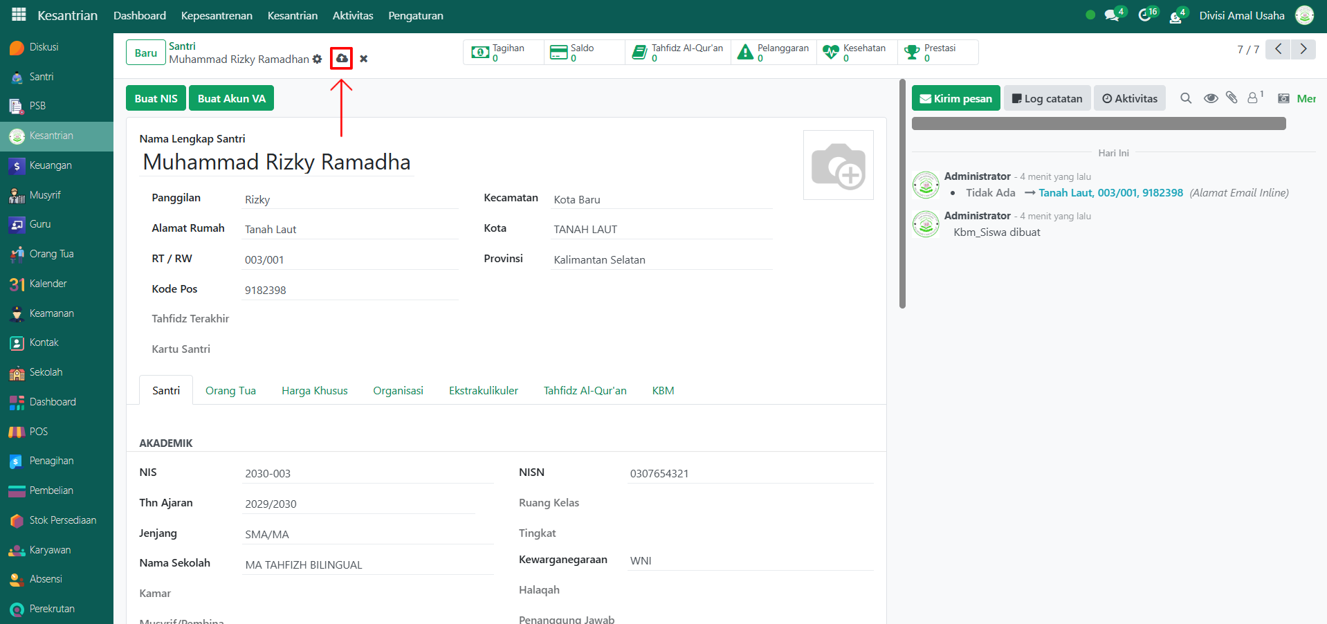 Setelah semua inputan diisi dengan benar, klik icon Simpan di sebelah kanan icon Gear agar data santri tersimpan di sistem.
