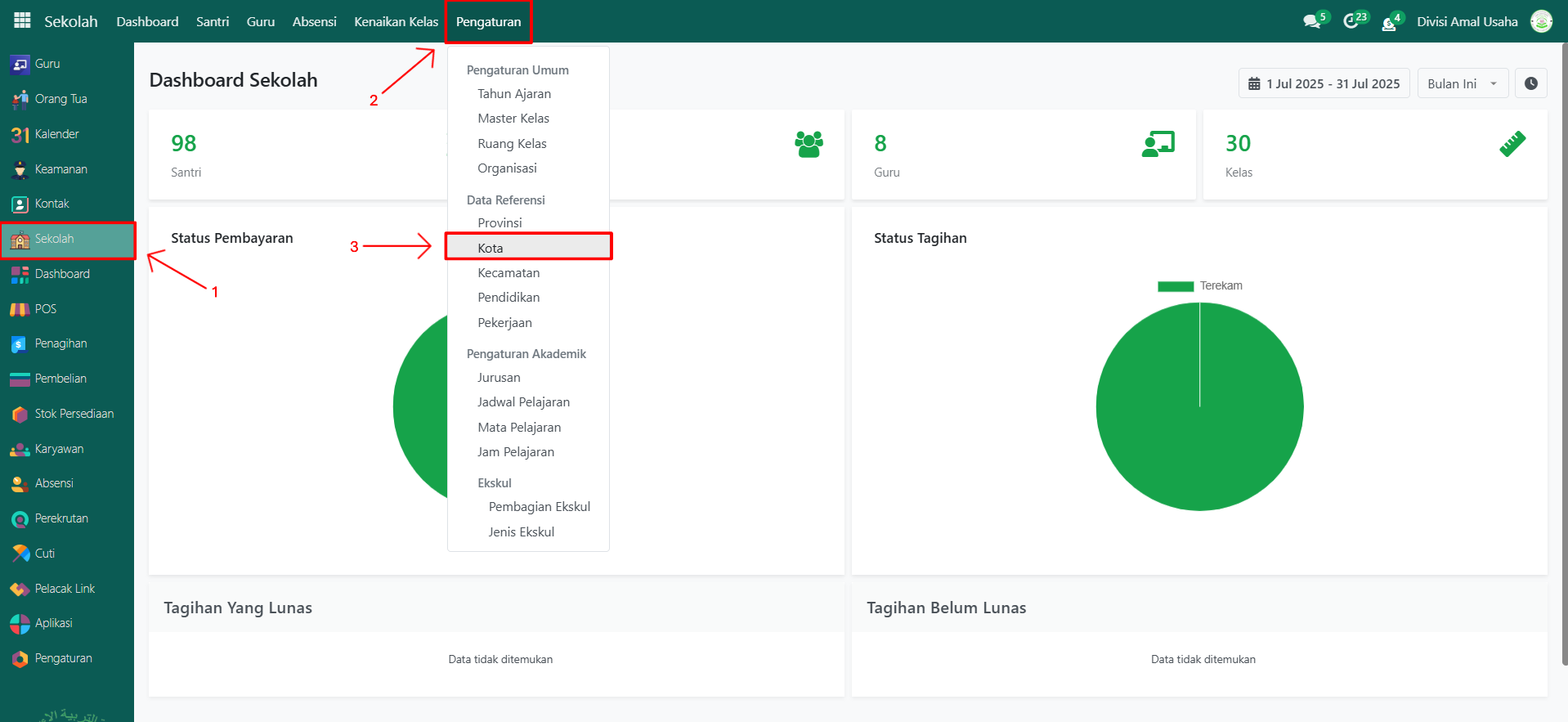 Buka modul Sekolah, lalu klik menu Pengaturan kemudian pilih submenu Kota.