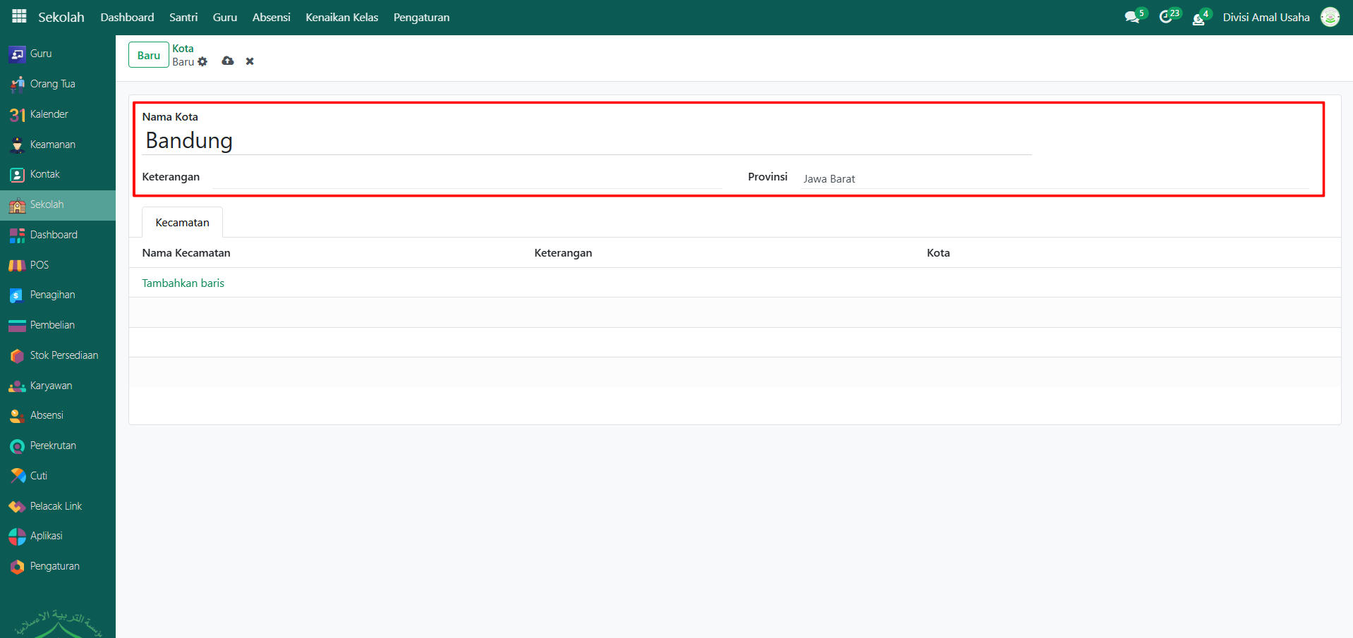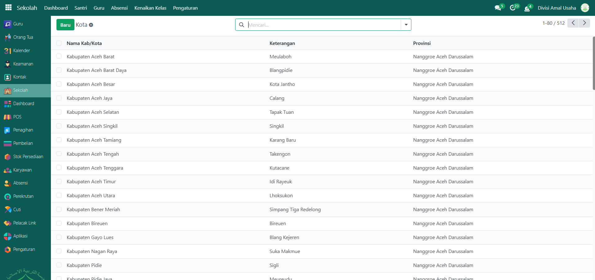 Berikut adalah langkah-langkah untuk melihat dan menambahkan data kota pada Odoo Pesantren.