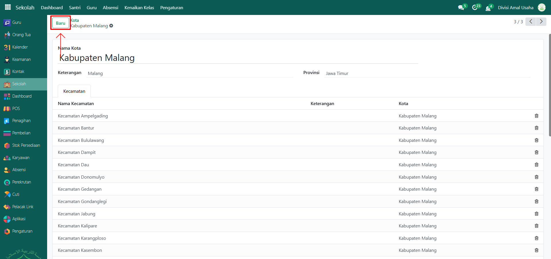 Jika ada kota/kabupaten yang belum tersedia, klik tombol "Baru" untuk menambah data.