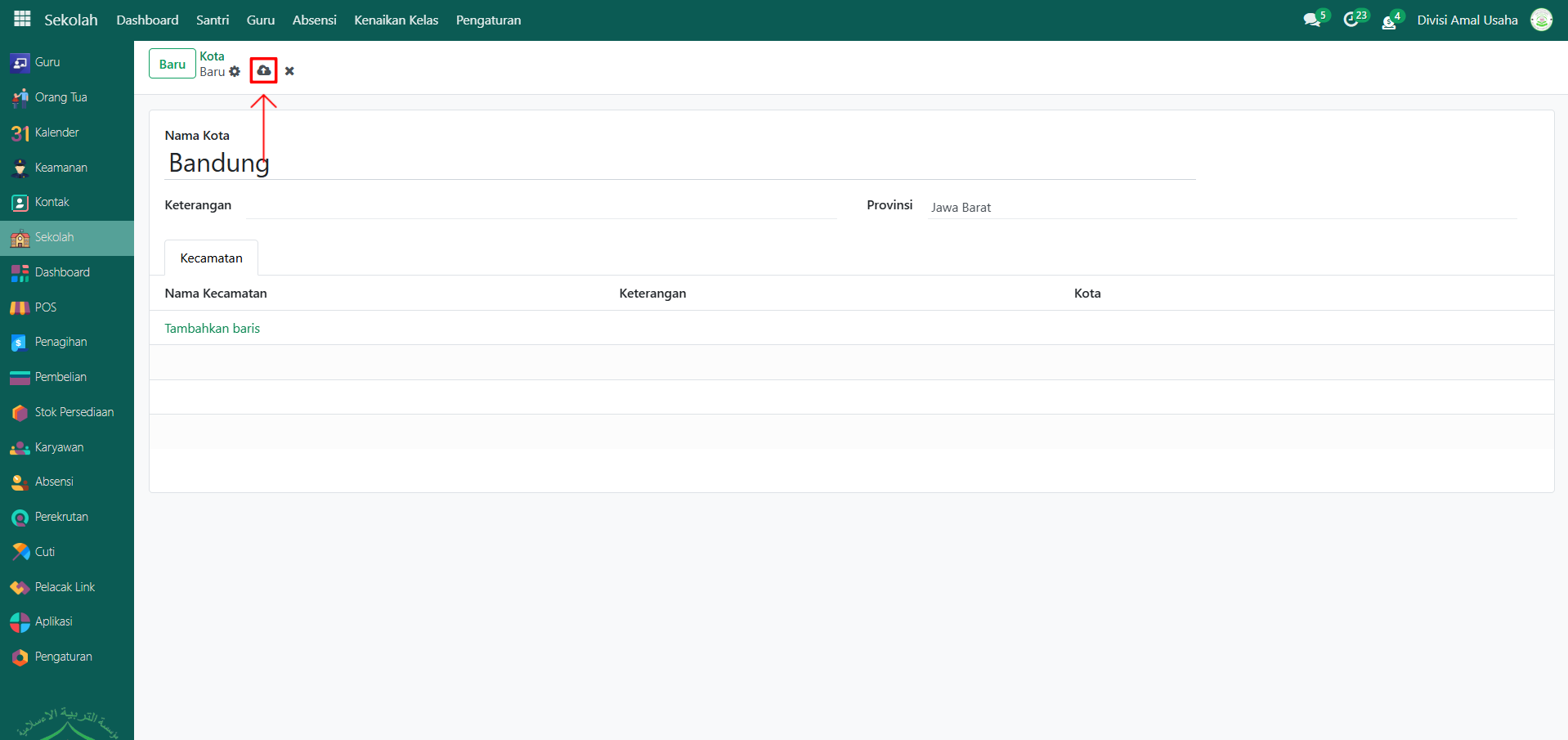 Setelah semua inputan diisi dengan benar, klik icon Simpan di sebelah kanan icon Gear agar data kota baru tersimpan di sistem.