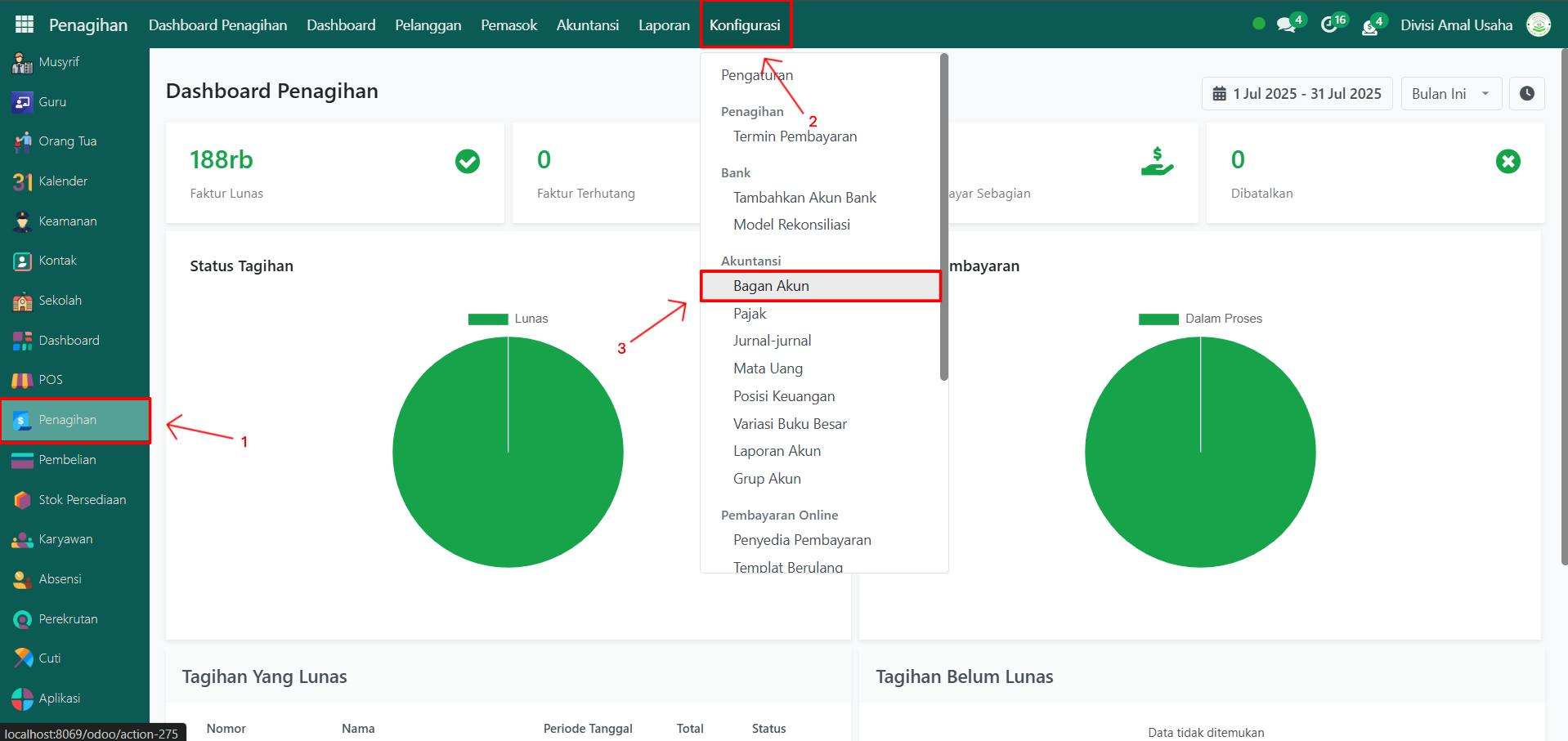 Buka Modul Penagihan, lalu klik menu Konfigurasi kemudian pilih submenu Bagan Akun/Chart of Account.