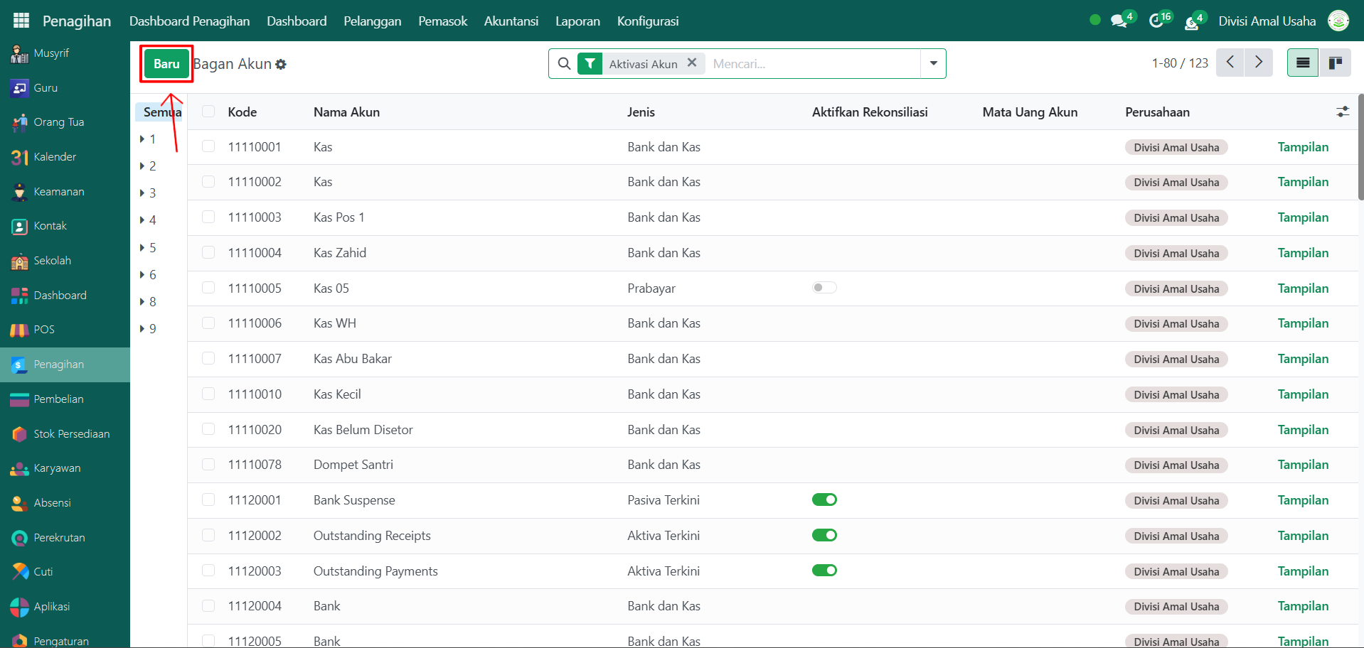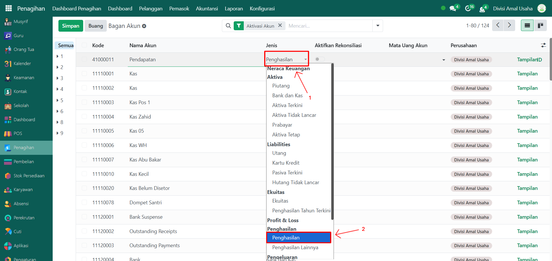 | Penjualan | Penghasilan (Income) | Mencatat pendapatan dari berbagai transaksi seperti penjualan di POS, biaya pendidikan, dan lainnya. |