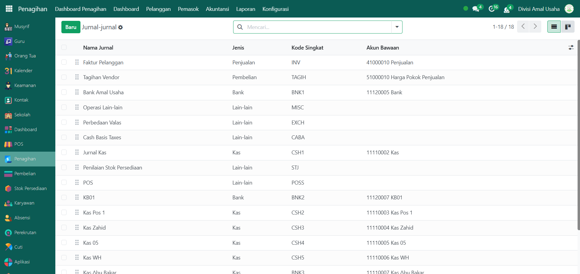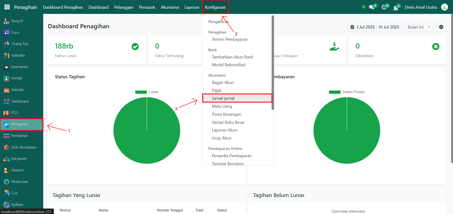 Buka Modul Penagihan, lalu klik menu Konfigurasi kemudian pilih submenu Jurnal-jurnal.