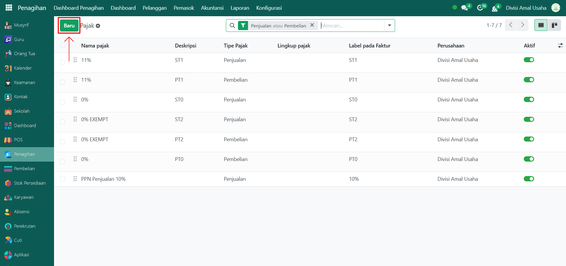 Klik tombol "Baru" untuk membuat pajak baru.