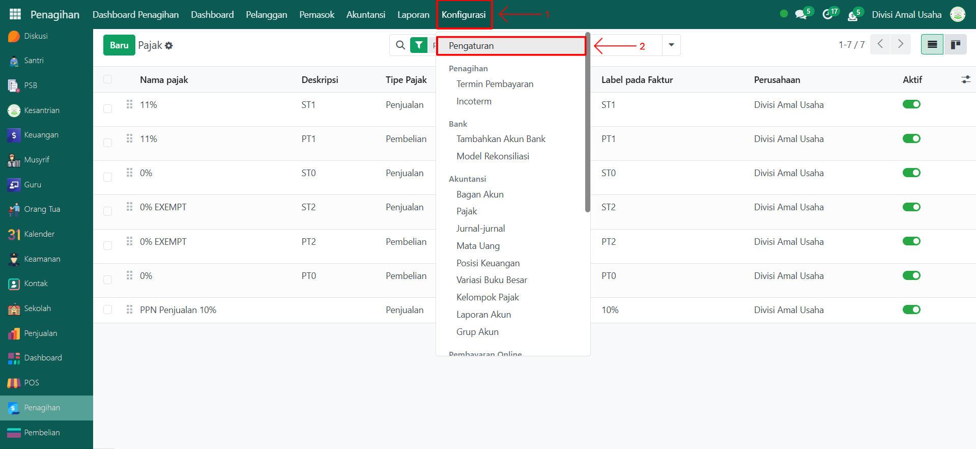 Dalam modul Penagihan, klik menu Konfigurasi kemudian pilih submenu Pengaturan.