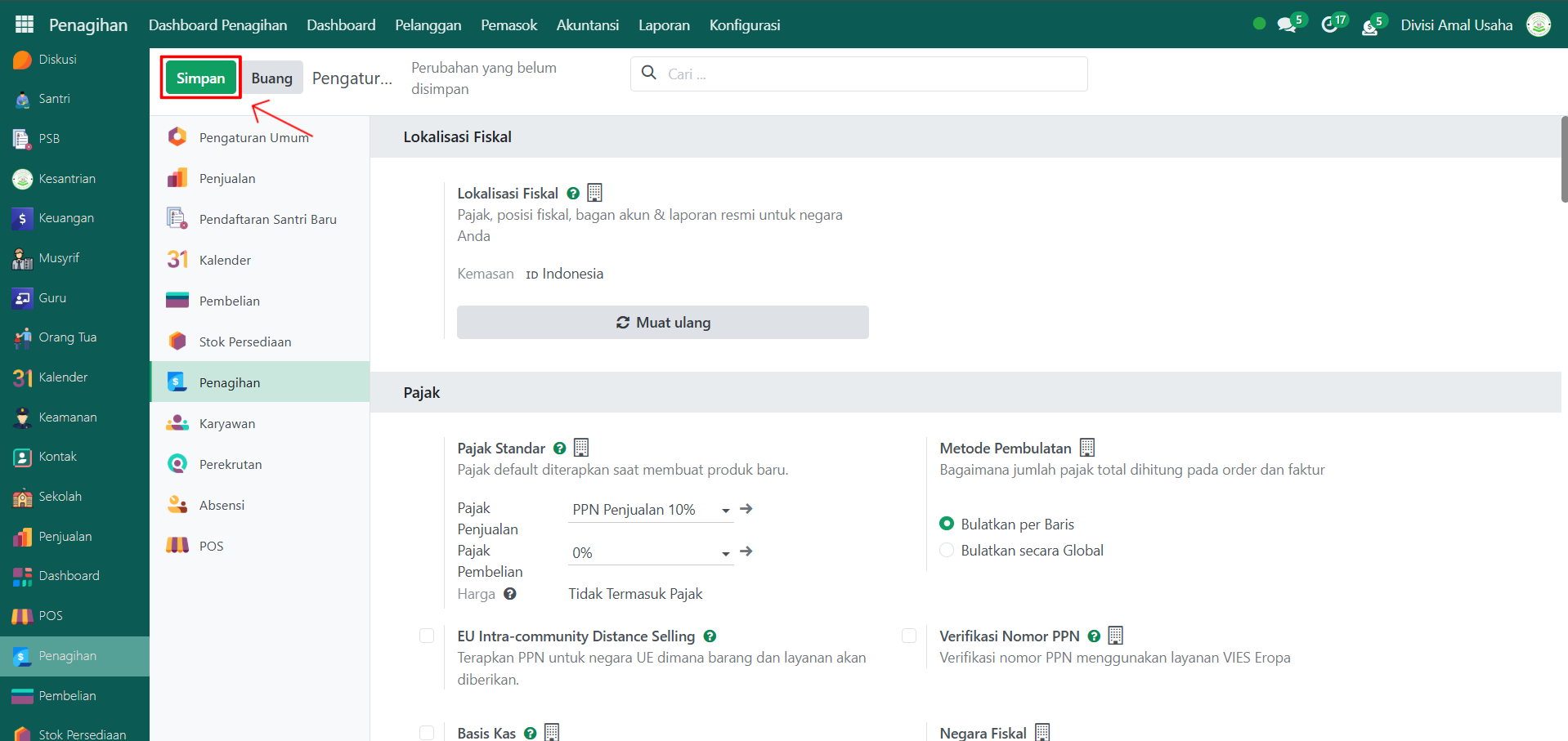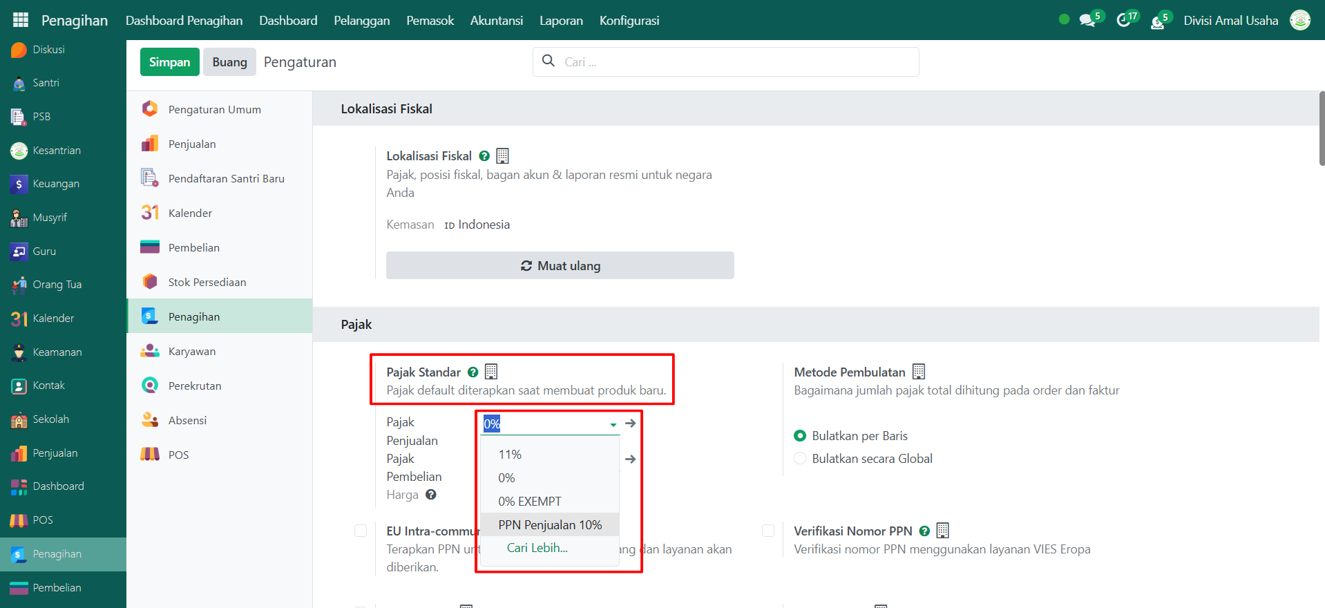 Berikut adalah langkah-langkah untuk mengatur pajak standar perusahaan pada Odoo Pesantren: