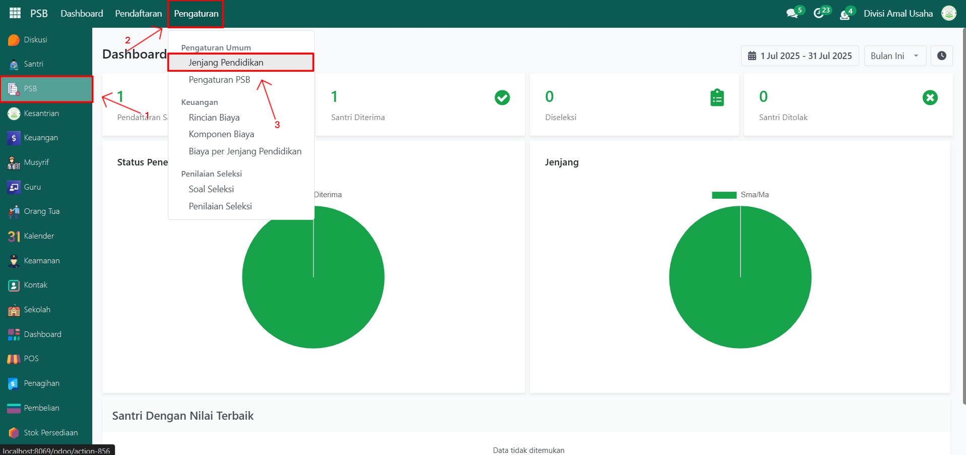 Buka Modul PSB, lalu klik menu Pengaturan kemudian pilih submenu Jenjang Pendidikan.