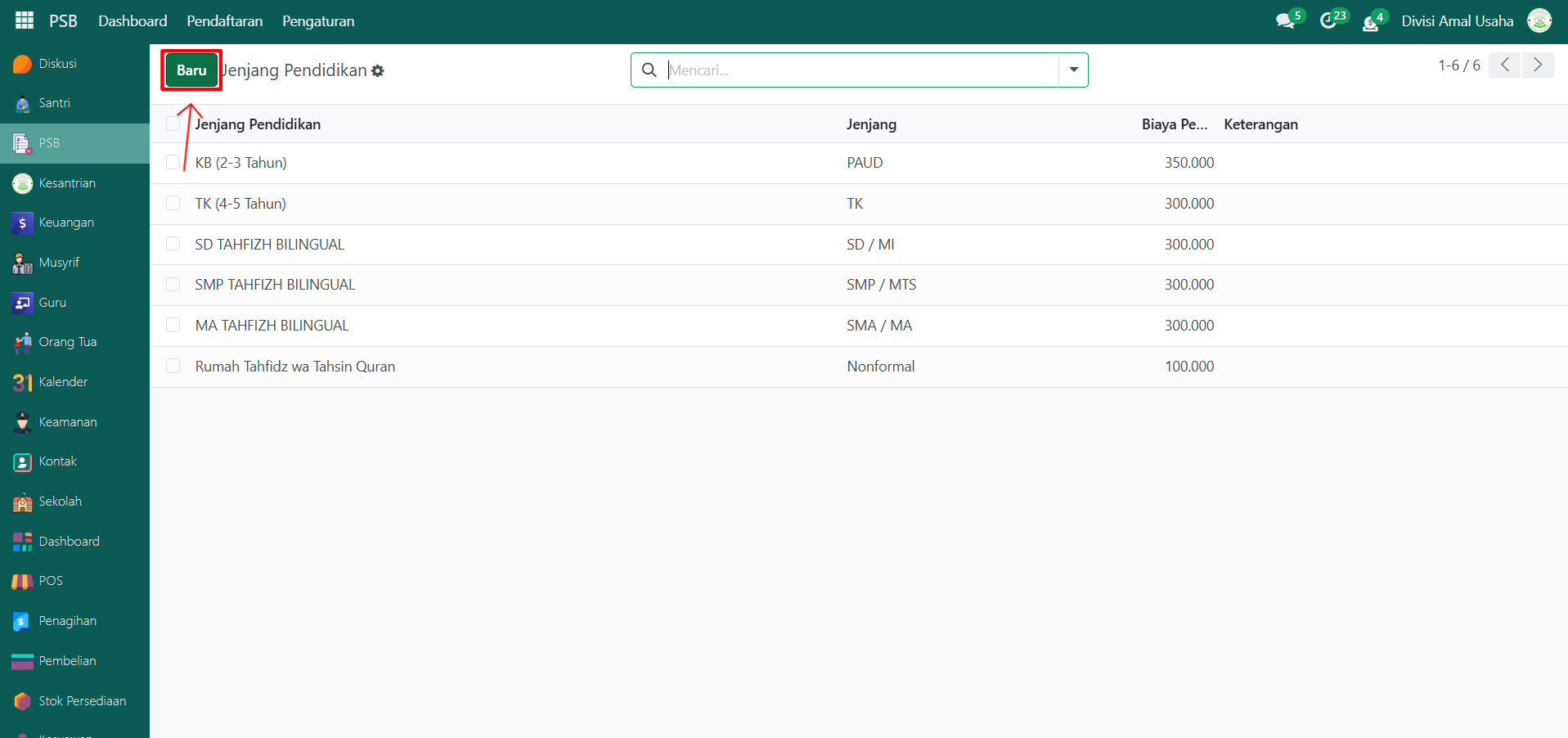 Berikut adalah langkah-langkah cara membuat jenjang pendidikan baru pada Odoo Pesantren.