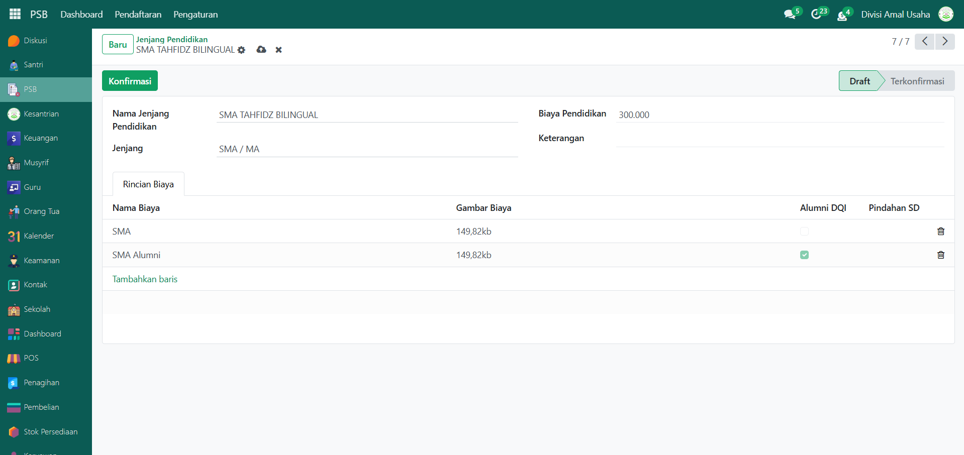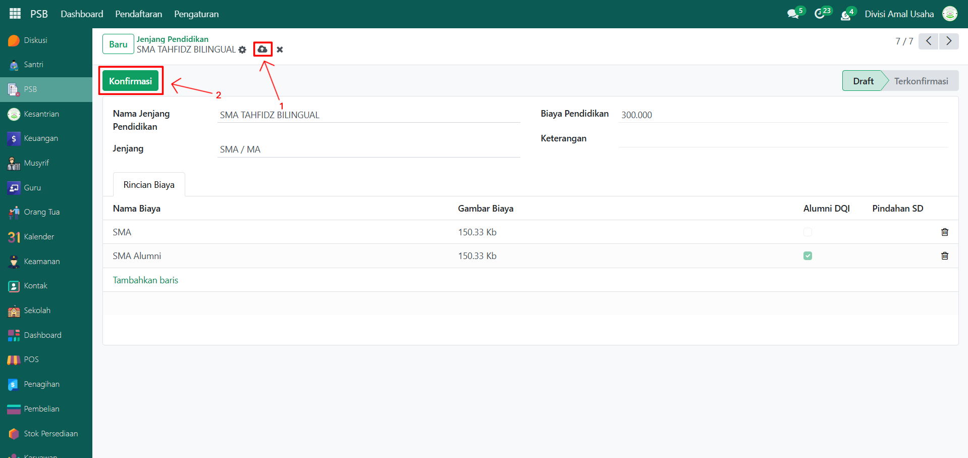 Setelah seluruh field diisi dengan benar, klik ikon Simpan di sebelah icon Gear untuk menyimpan jenjang pendidikan, lalu klik tombol Konfirmasi untuk mengunci data jenjang pendidikan sehingga tidak bisa diubah sembarangan dan siap digunakan pada proses PSB maupun transaksi biaya pendidikan.