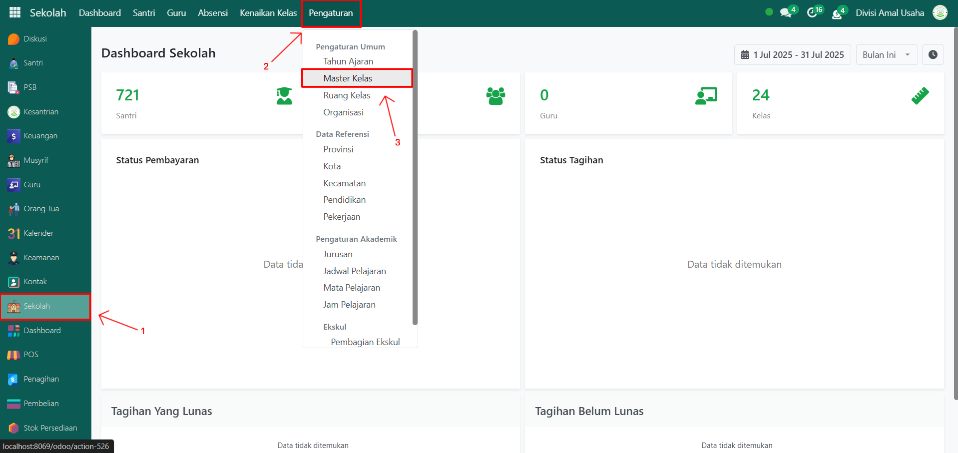 Buka Modul Sekolah, lalu klik menu Pengaturan dan pilih submenu Master Kelas.