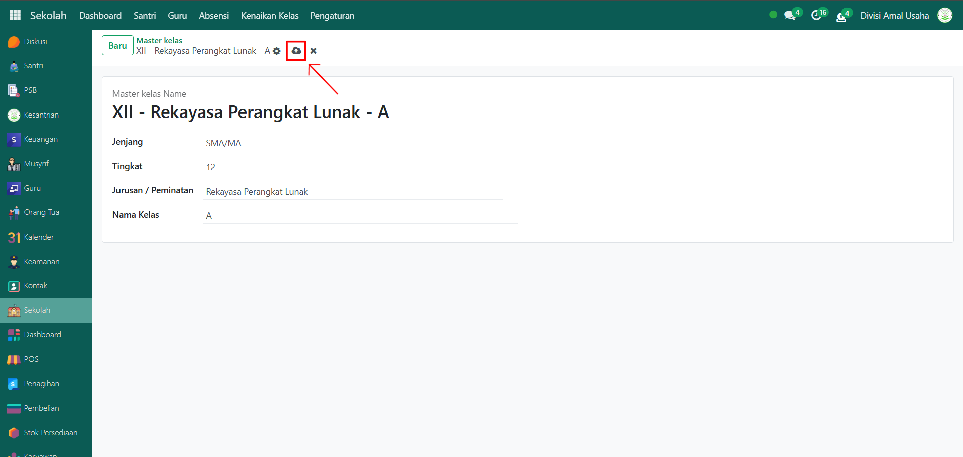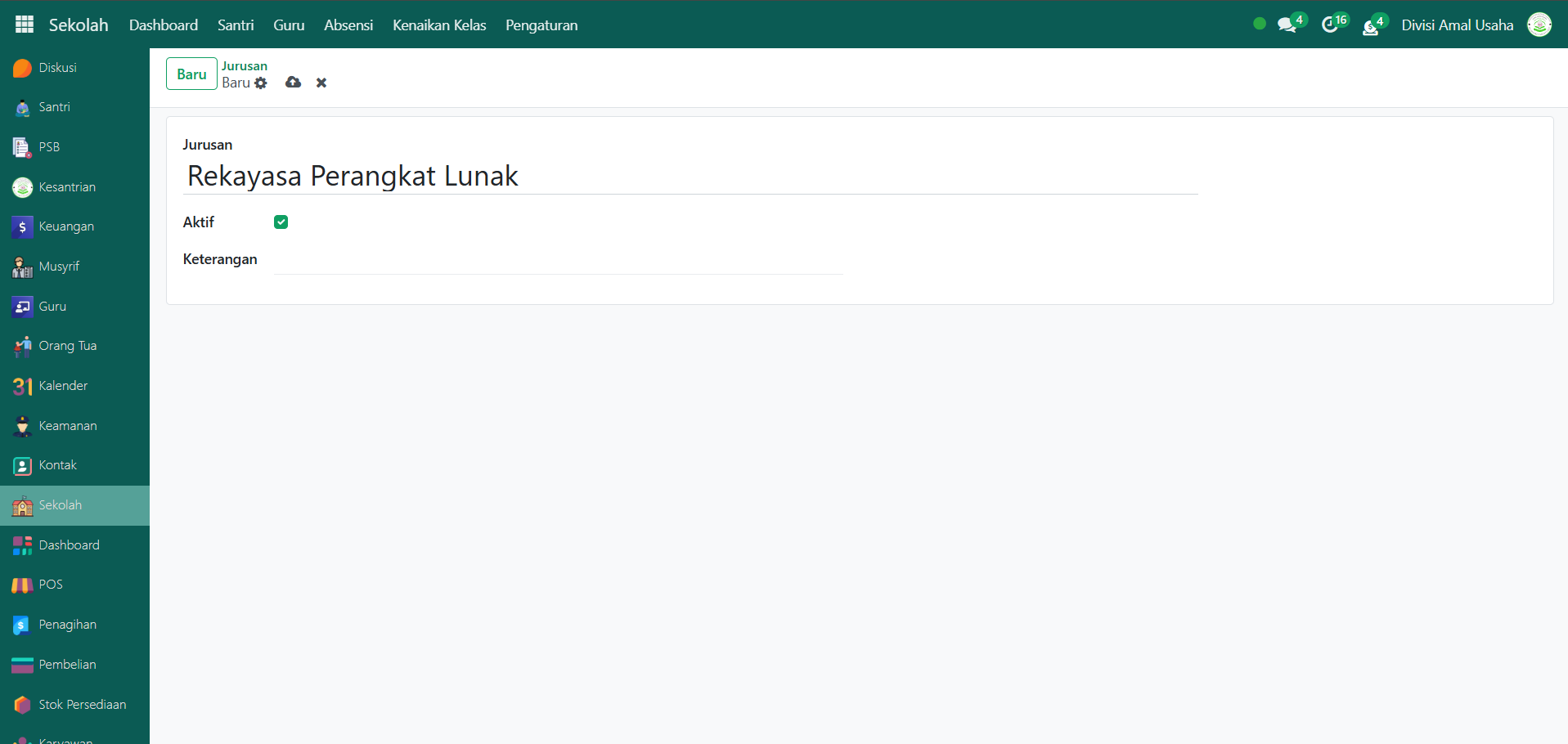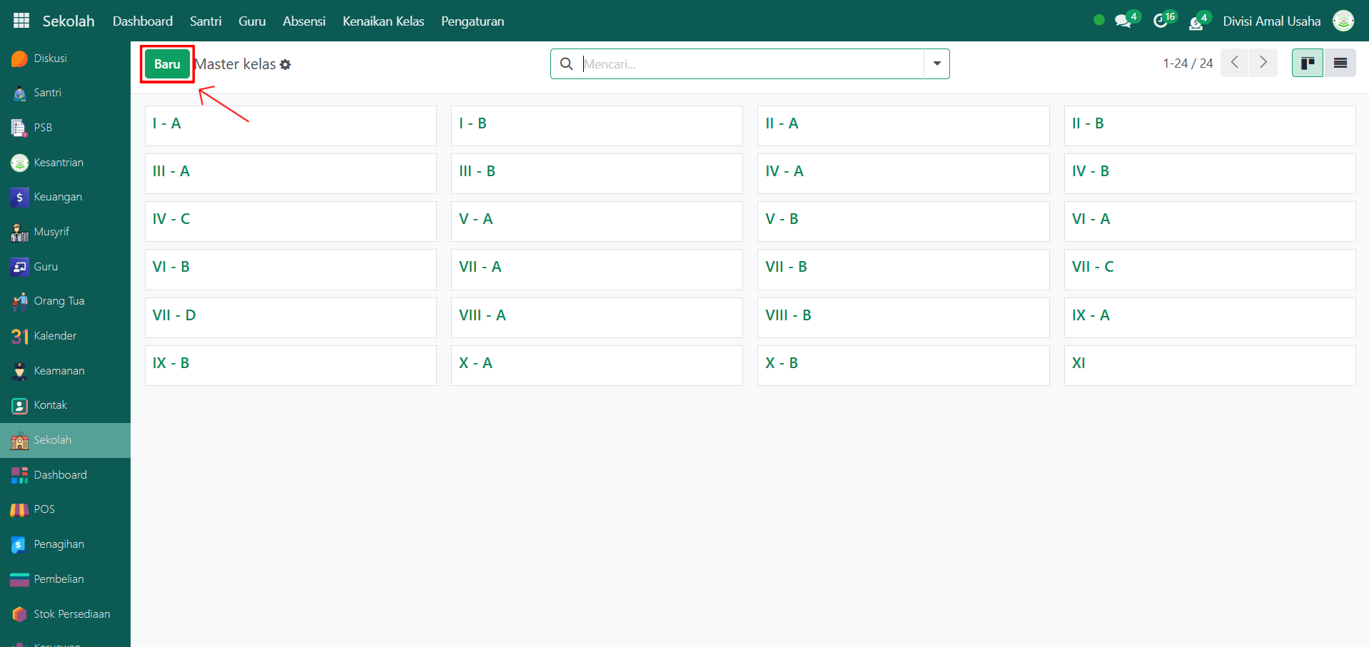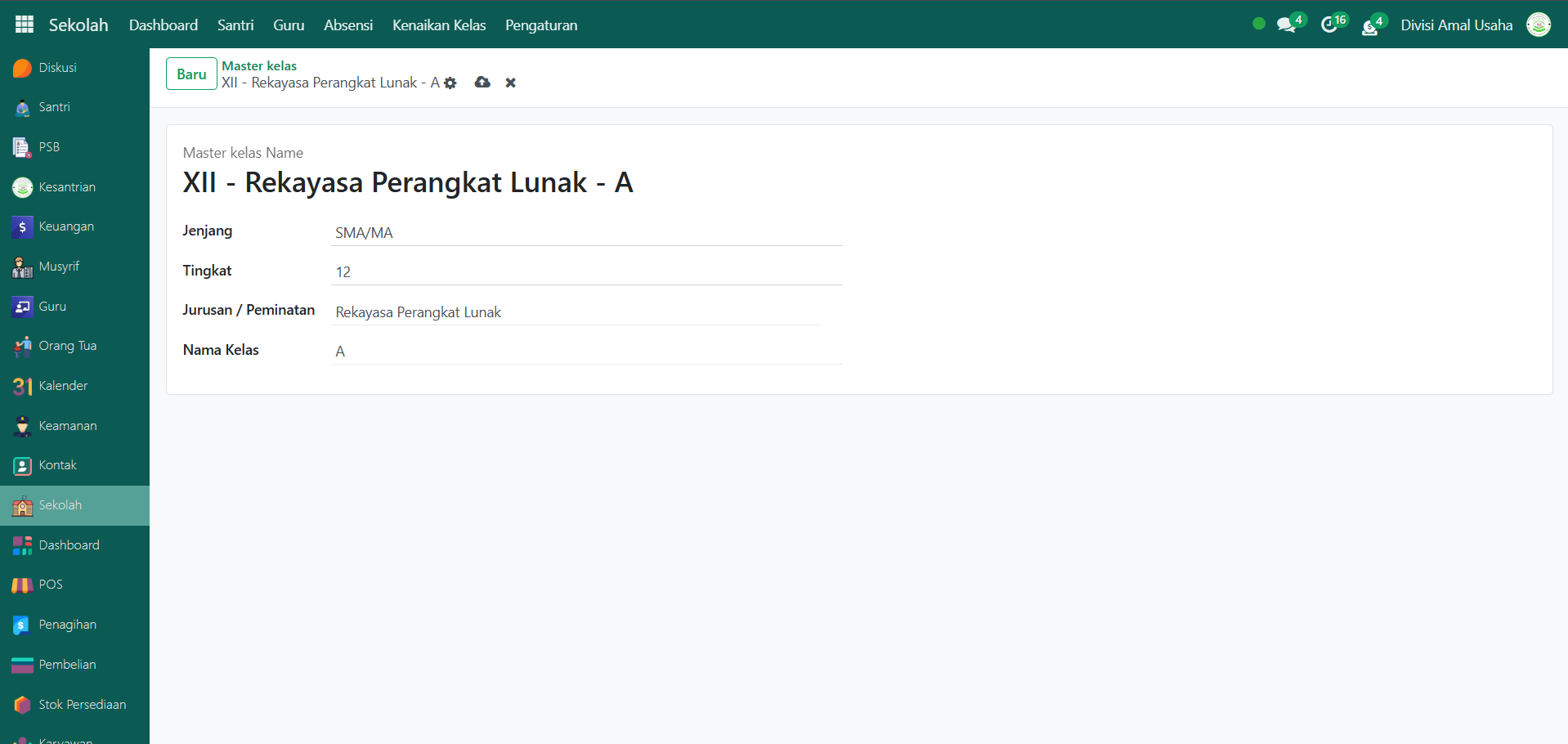 Berikut adalah langkah-langkah membuat kelas baru untuk pendataan akademik santri di Modul Sekolah.