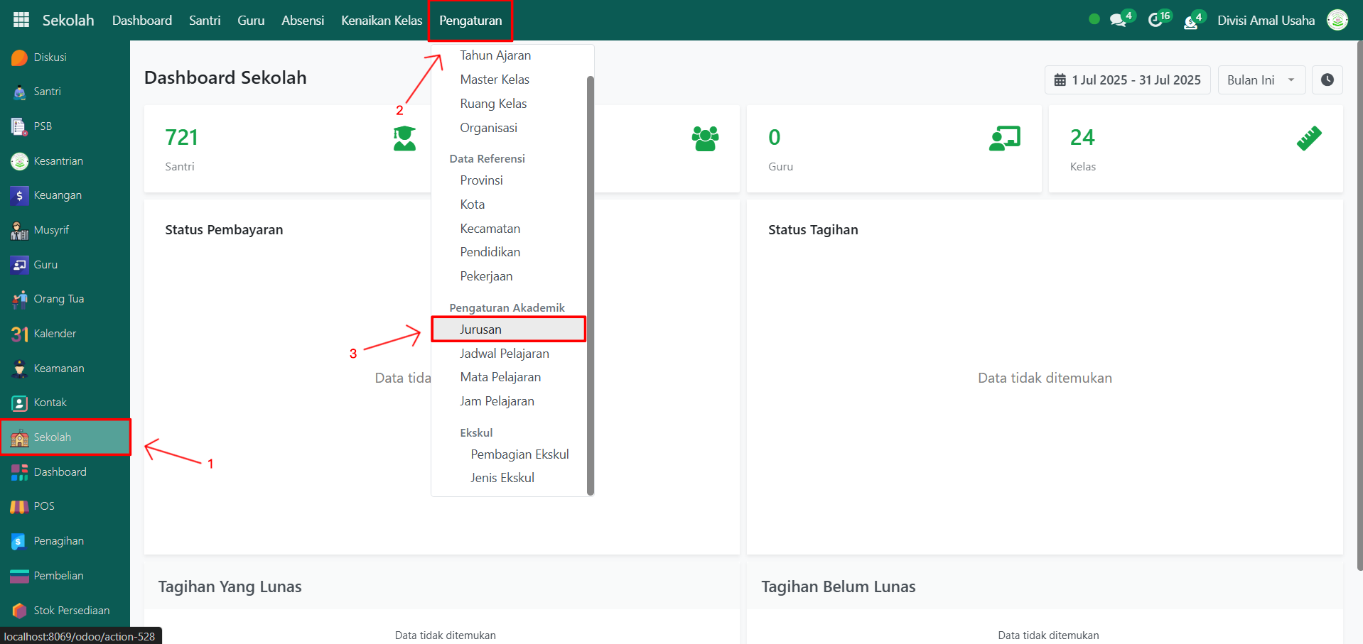 Buka Modul Sekolah, lalu klik menu Pengaturan kemudian pilih submenu Jurusan.