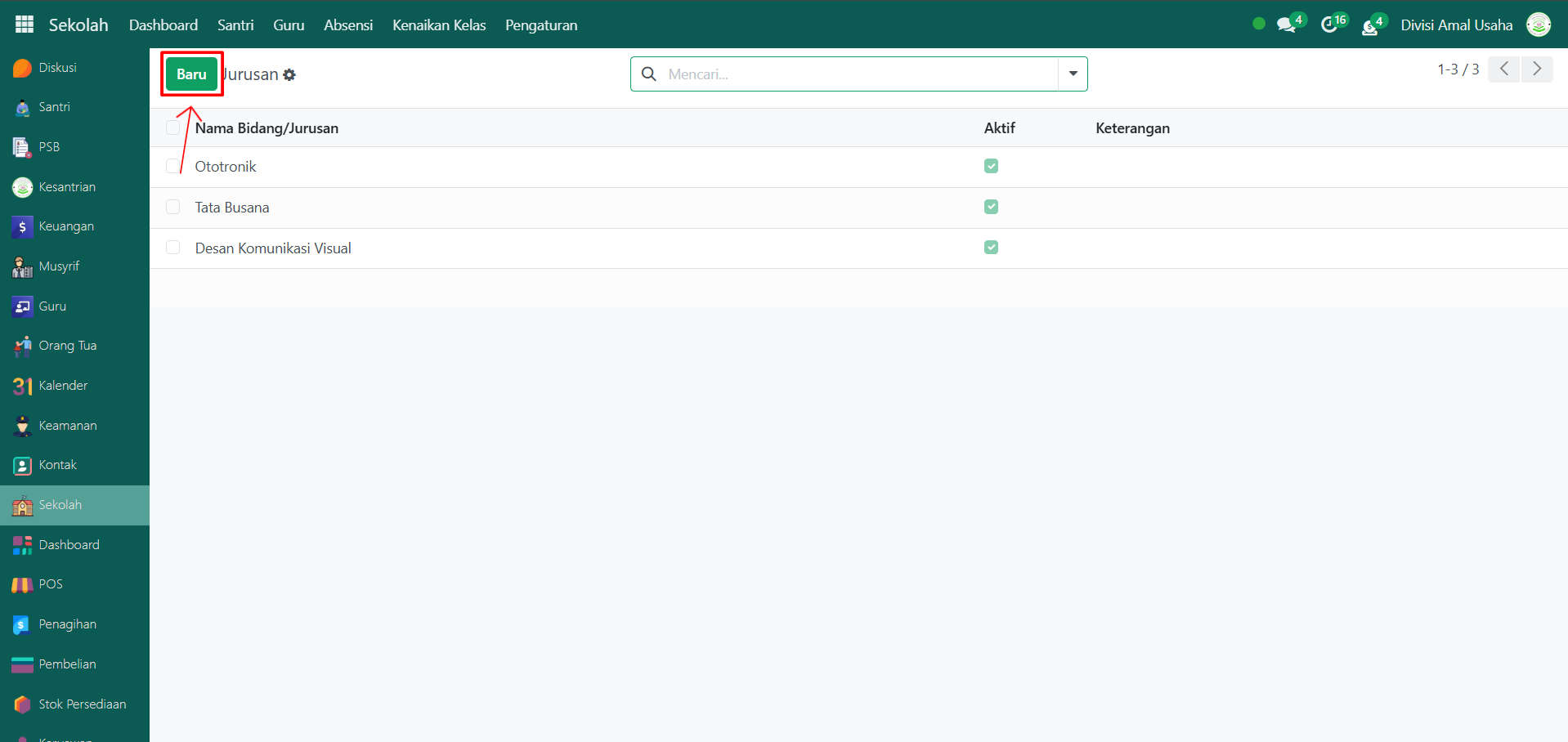 Klik tombol “Baru” untuk menambahkan jurusan baru.