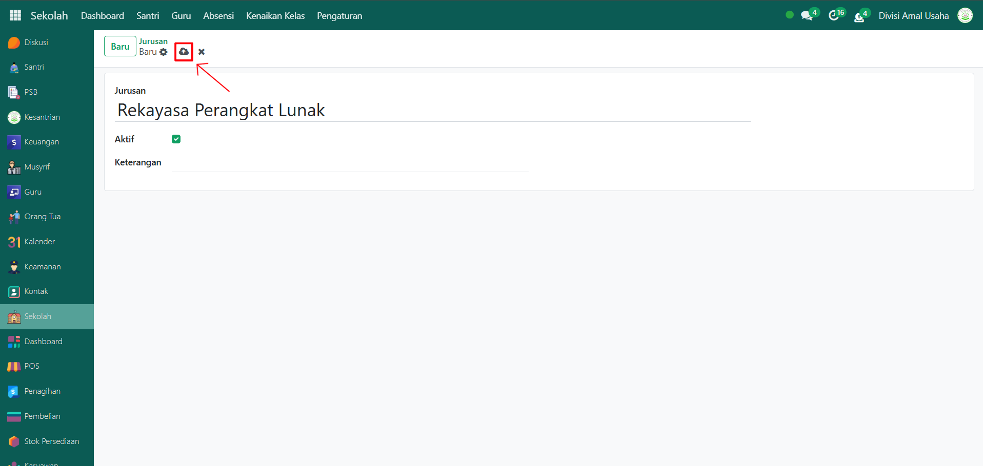 Terakhir, klik icon Simpan di sebelah kanan icon Gear agar jurusan baru tersimpan di sistem.