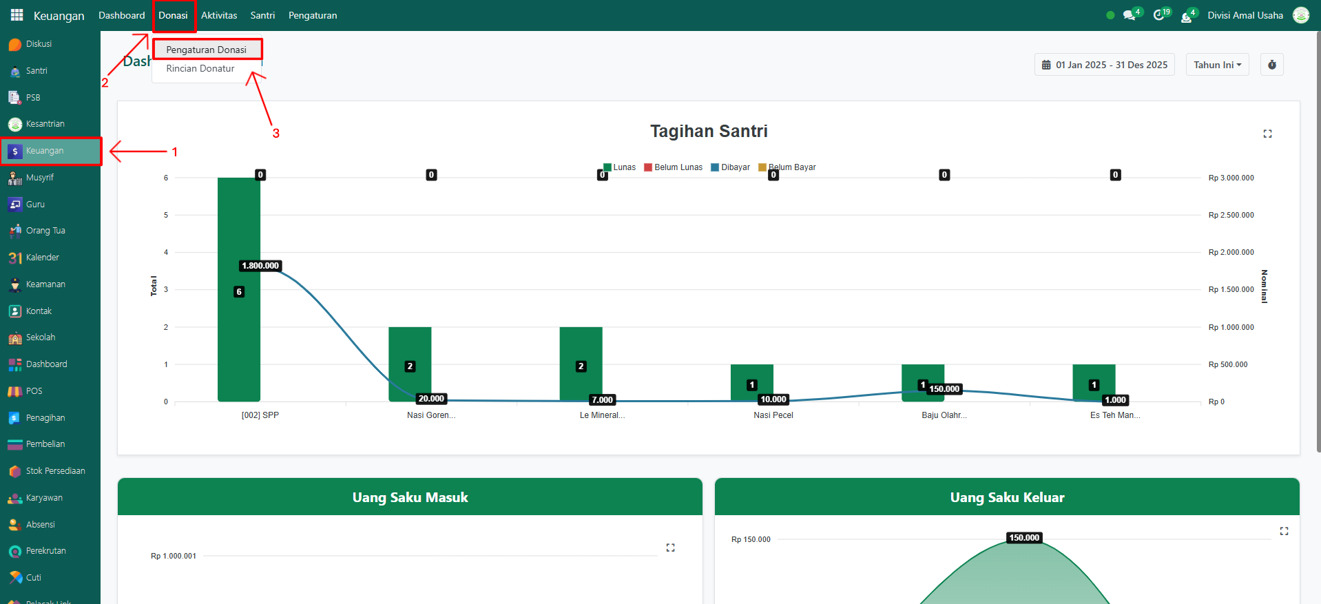 Buka modul Keuangan, lalu klik menu Donasi kemudian pilih submenu Pengaturan Donasi.