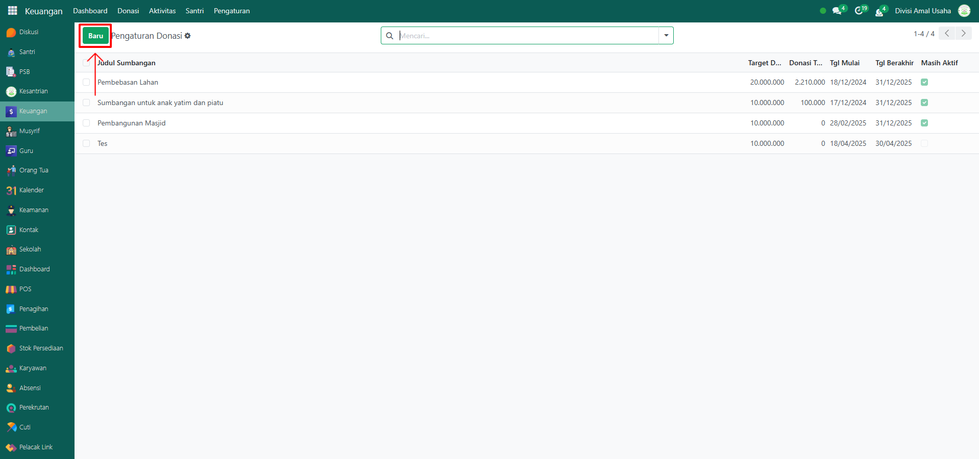 Klik tombol "Baru" untuk membuat jenis donasi baru.