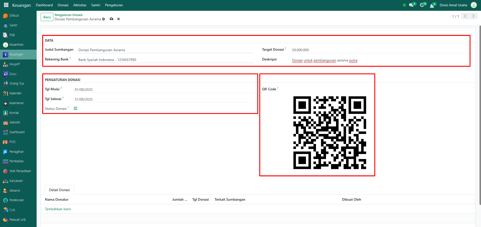 Pengaturan Donasi digunakan untuk menambahkan dan mengelola jenis donasi yang ada di Odoo Pesantren, seperti donasi pembangunan, beasiswa, atau kegiatan sosial lainnya. Administrator dapat menentukan detail donasi mulai dari rekening bank, target donasi, hingga periode kegiatan.