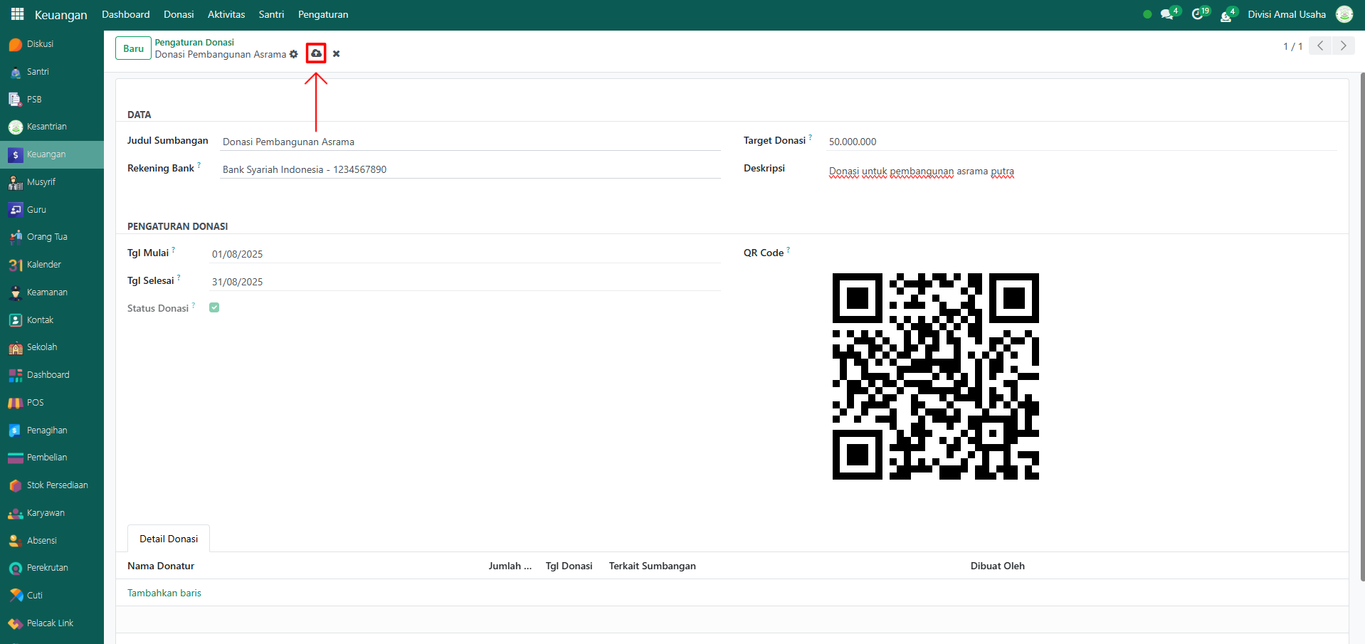 Setelah semua inputan diisi dengan benar, klik ikon Simpan di sebelah kanan ikon Gear agar data donasi tersimpan di sistem.