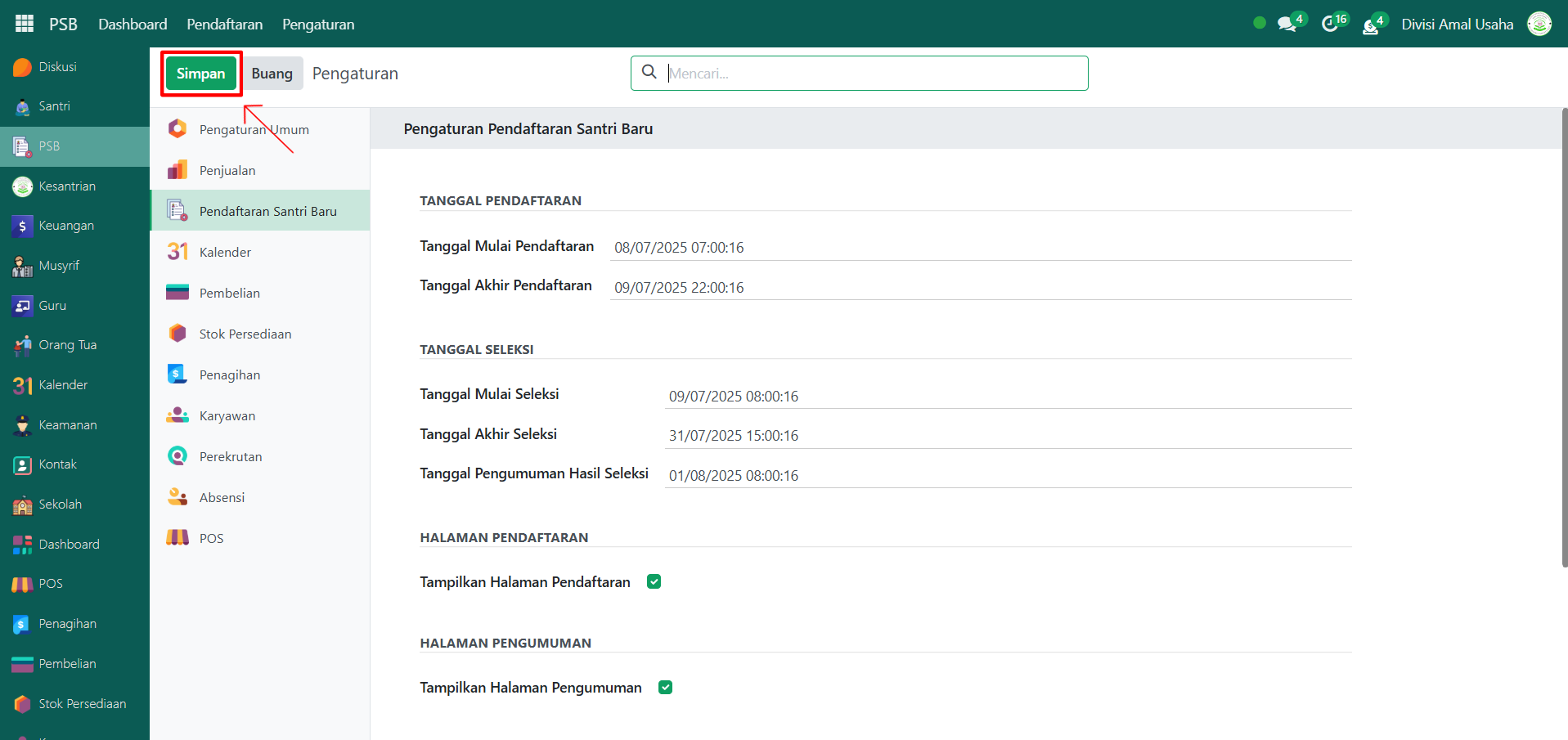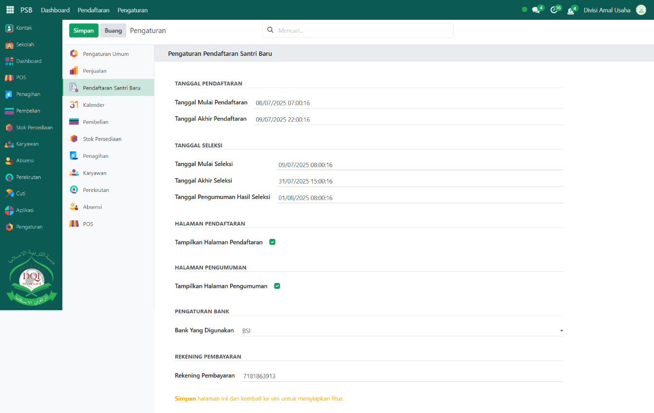 - Tampilkan Halaman Pendaftaran → aktifkan agar halaman pendaftaran online dapat diakses calon santri.