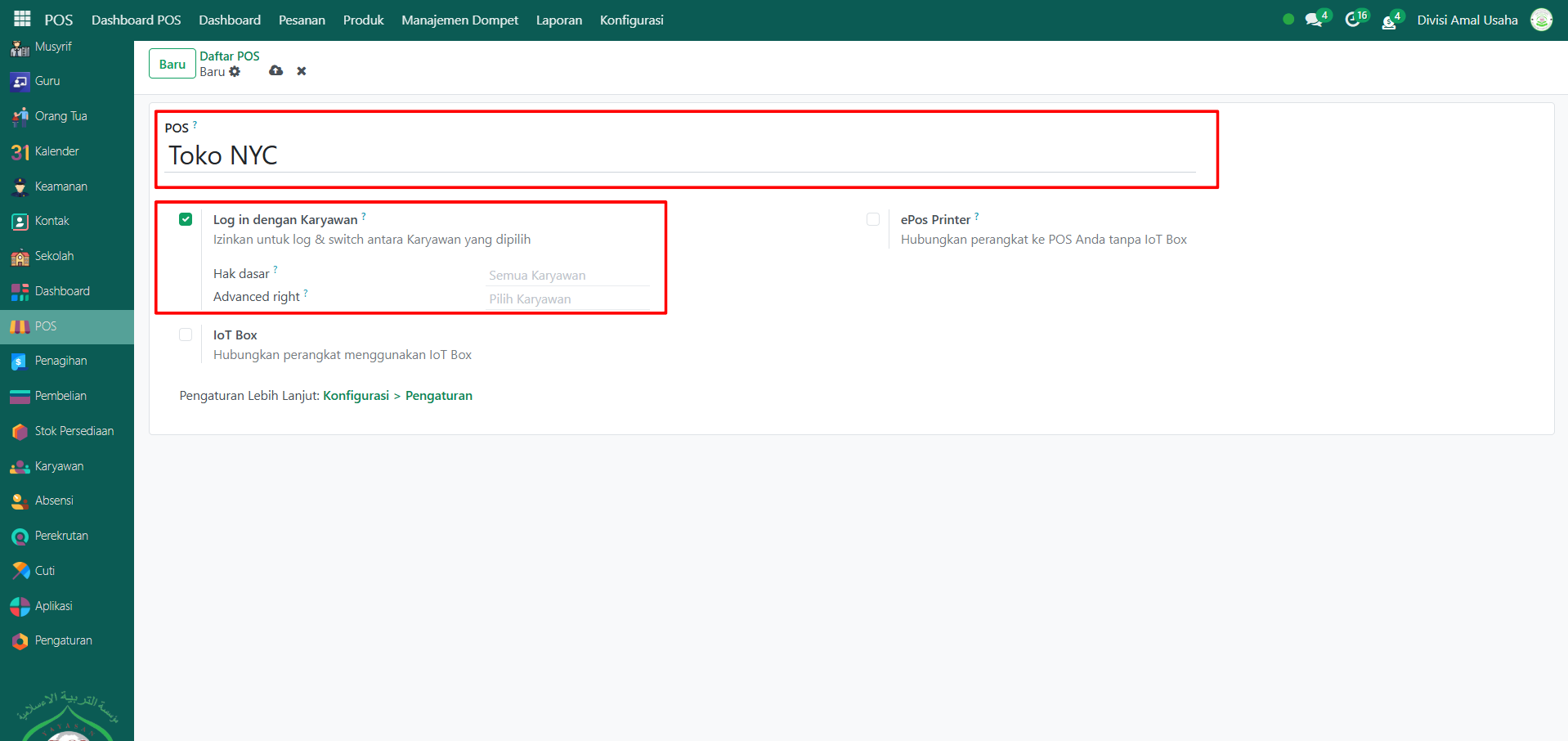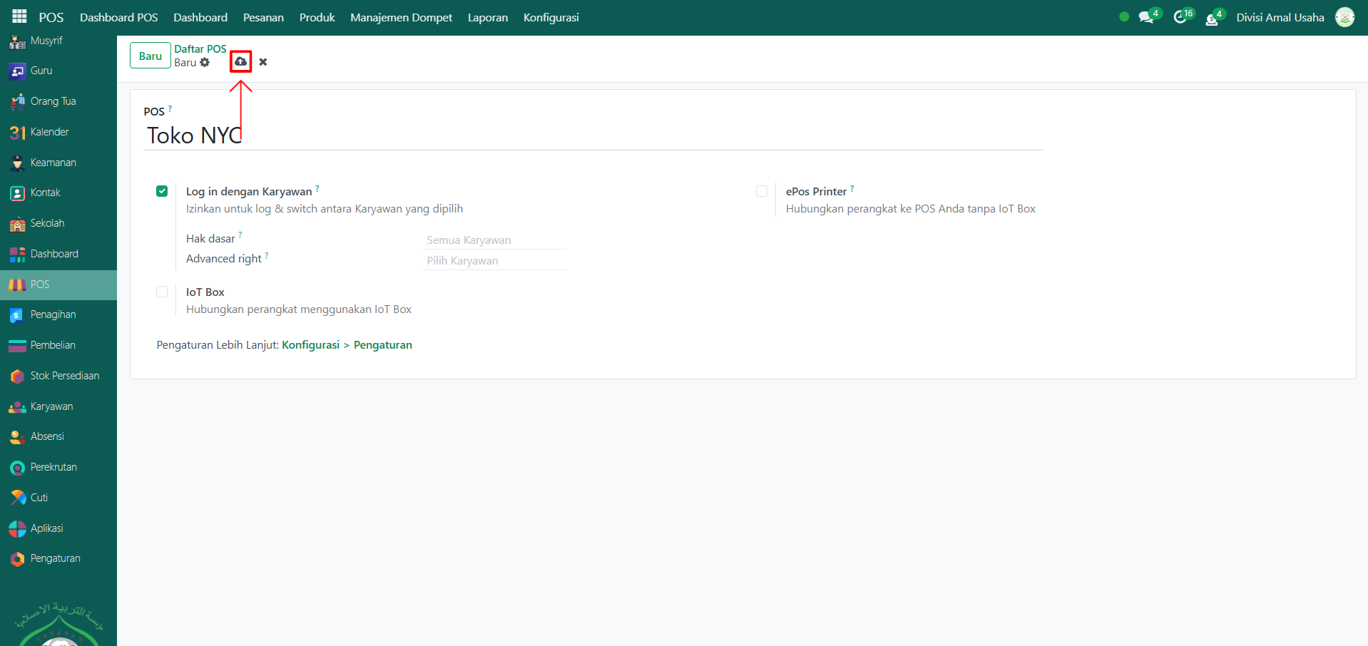 - Log in dengan Karyawan → aktifkan agar karyawan bisa login ke sesi POS.