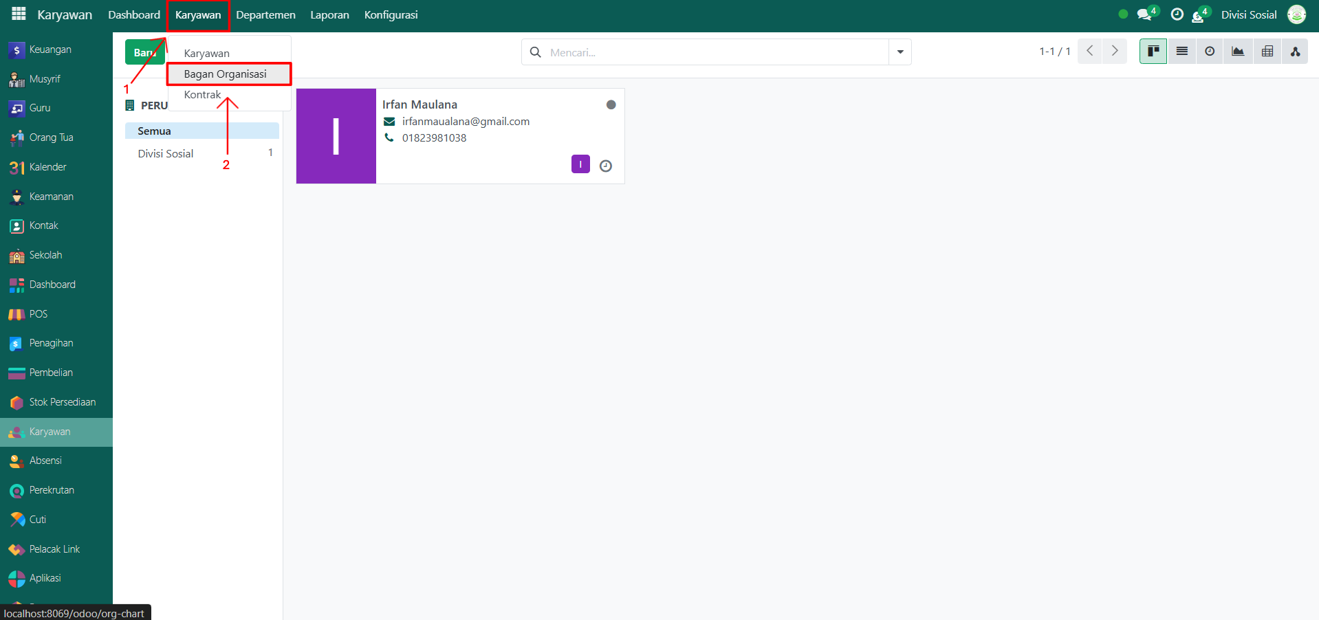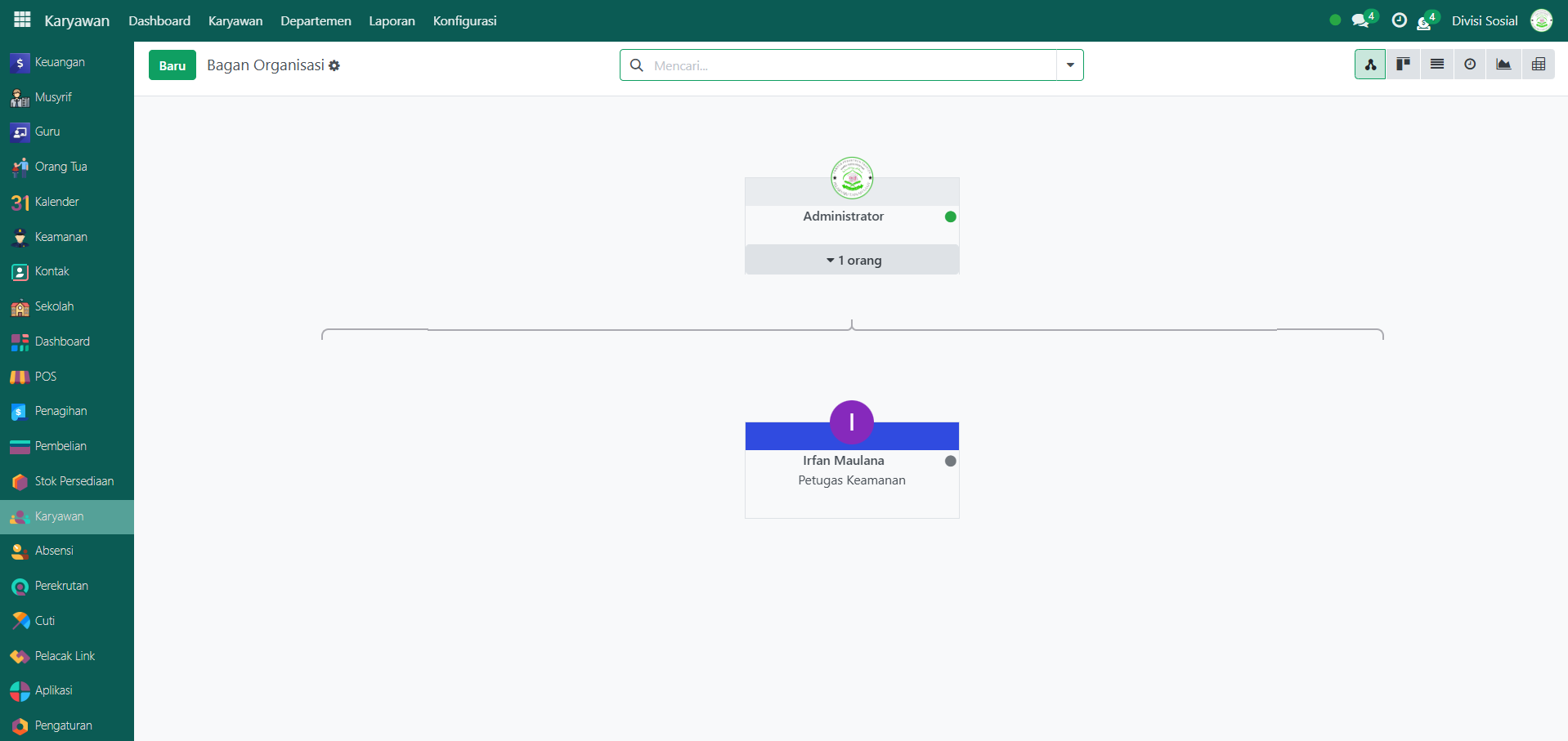 Pada modul yang sama, klik menu Karyawan, lalu pilih submenu Bagan Organisasi.