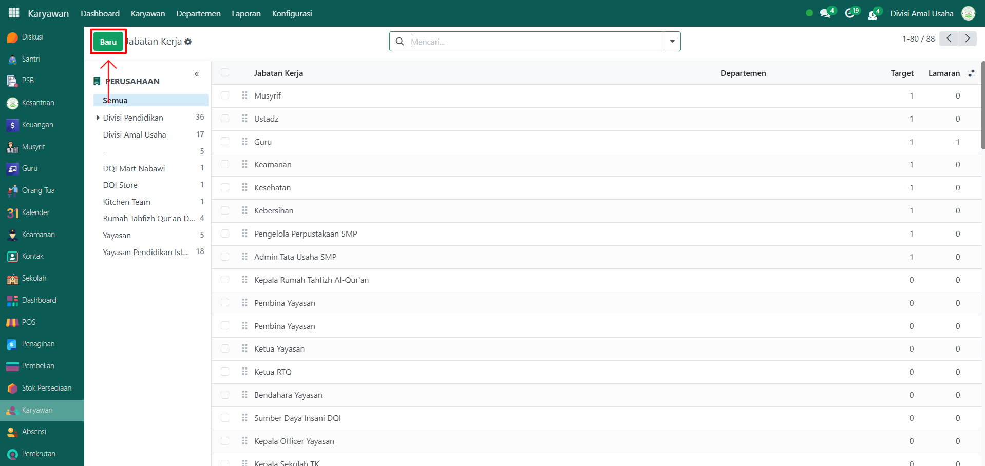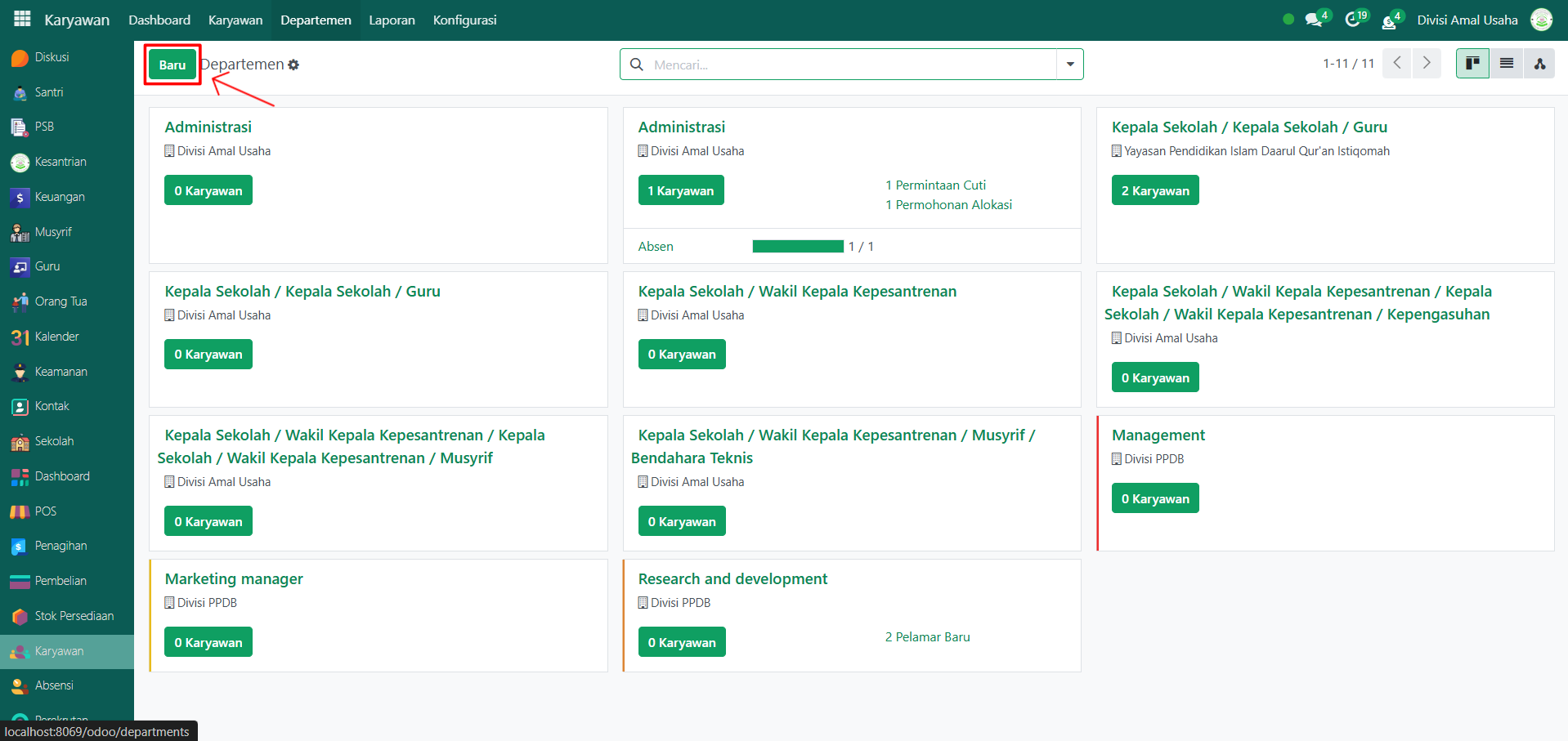 Klik tombol "Baru" untuk membuat departemen baru.