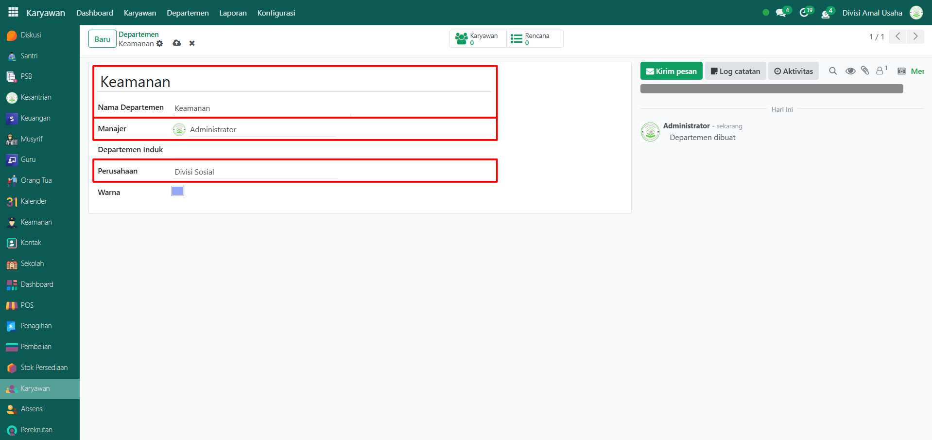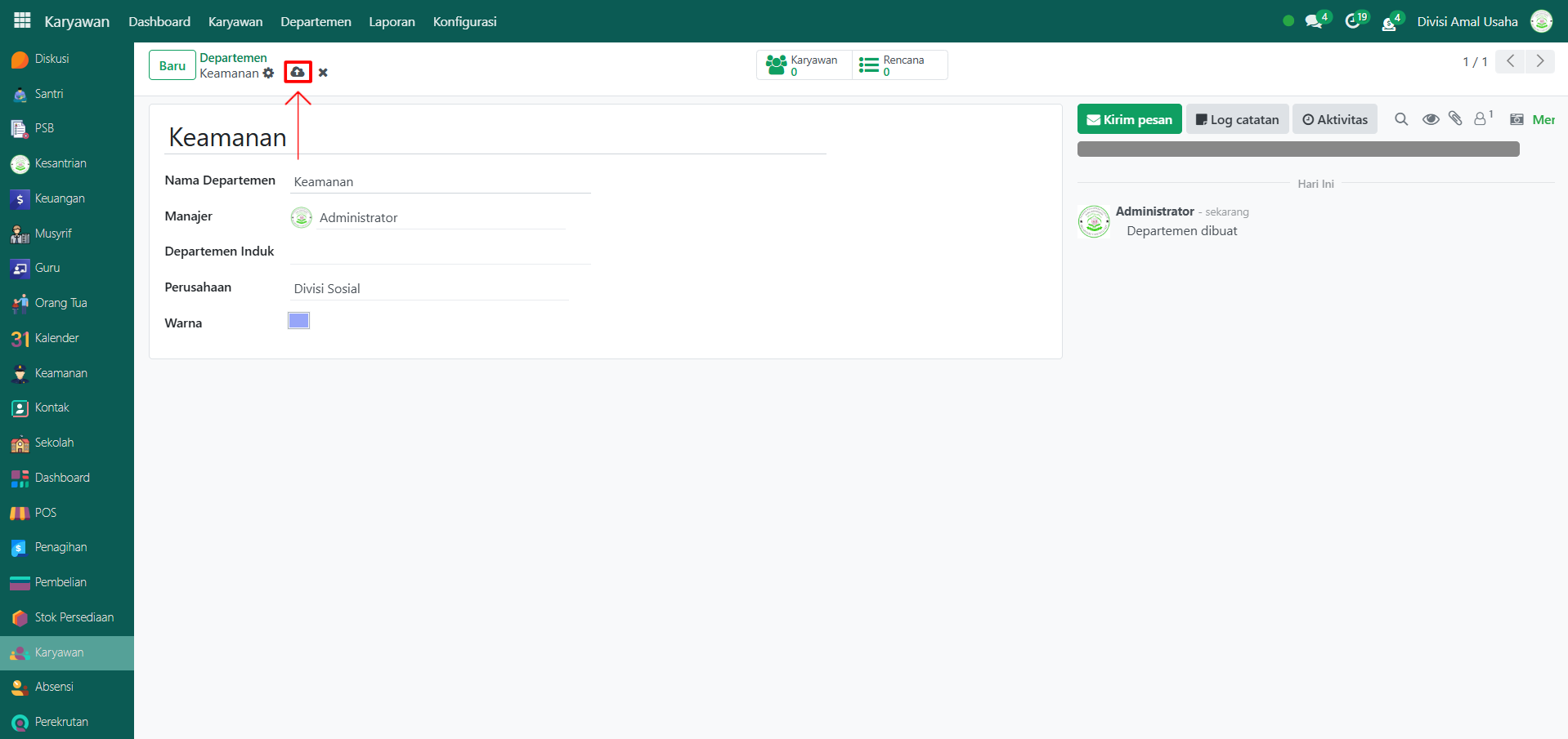 Setelah semua inputan selesai diisi, klik icon Simpan di sebelah kanan icon Gear agar departemen tersimpan di sistem.